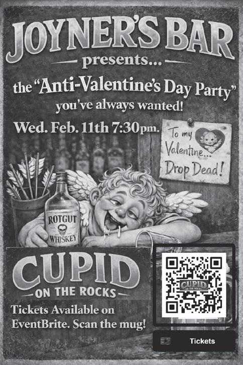 Now, McKeny and March have formed a new company called POE & Co. Entertainment and are back with a new Valentine’s Day presentation called “Cupid on the Rocks,” which will take place at 7:30 p.m. on February 11 at Joyner’s Bar, 854 W. Fourth St., WinstonSalem. Single tickets are $25, couples’ tickets are $40, and can be pre-ordered at https://www.eventbrite.com/e/mybad-romance-by-cupid-on-the-rockstickets-1979893285113?a =oddtdtcre ator. Given the format and setting, this event is restricted to ages 21 and over.