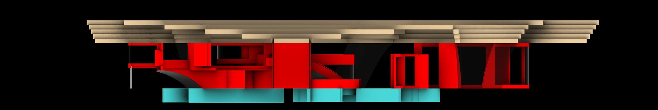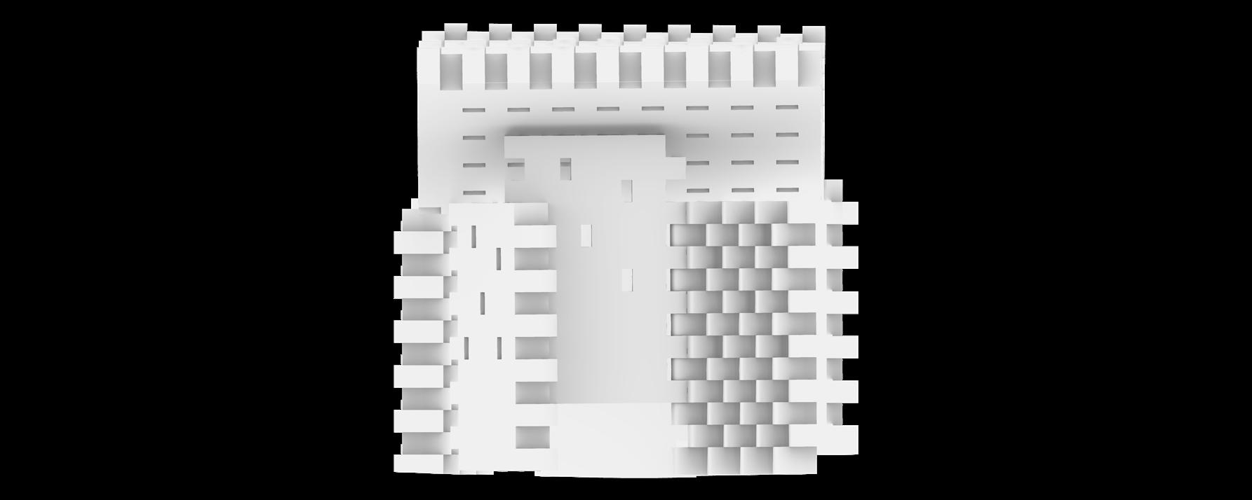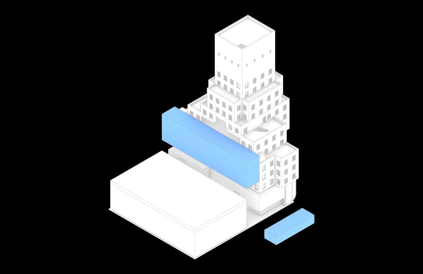 This adaptive reuse project transforms the historic E. Clem Wilson Building in Los Angeles into a Center for Art, Media, and Performance. Beginning with studies of host–attachment relationships through chunk models, the design evolved through multiple iterations that rethink how new architecture engages the existing. Rather than wrapping or intruding upon the original tower, the intervention is conceived as emerging from it, treating the historic structure as a generator of new form. A structural waffle originates at the ground floor and expands outward into a new public framework that supports performance and public spaces. Within the original building, educational and institutional programs are organized vertically, while shared commons act as transitional zones between the historic core and the new spatial extension.