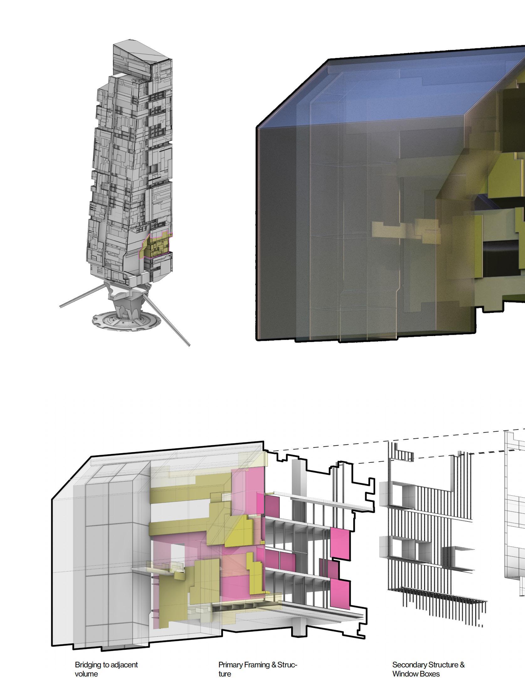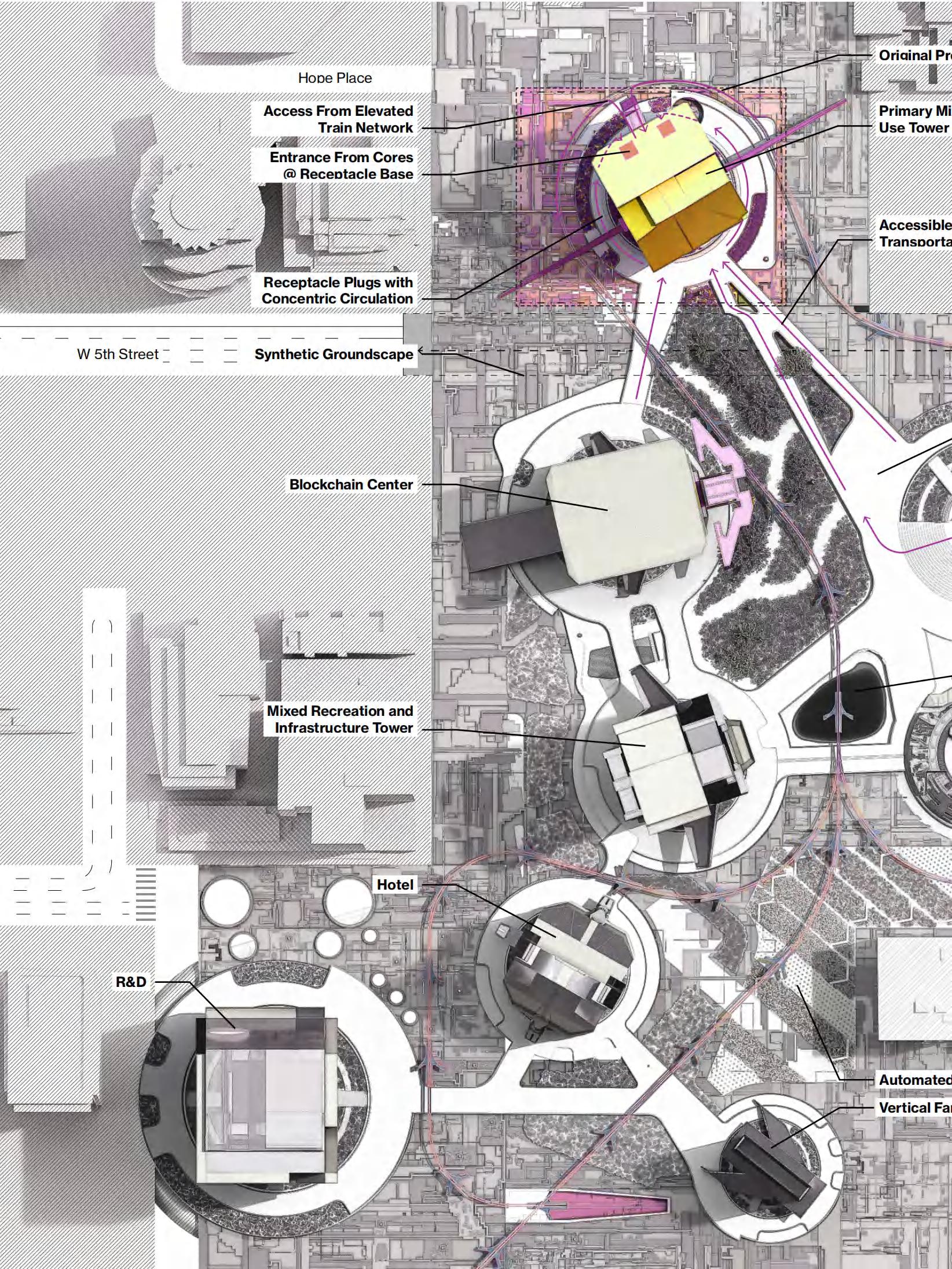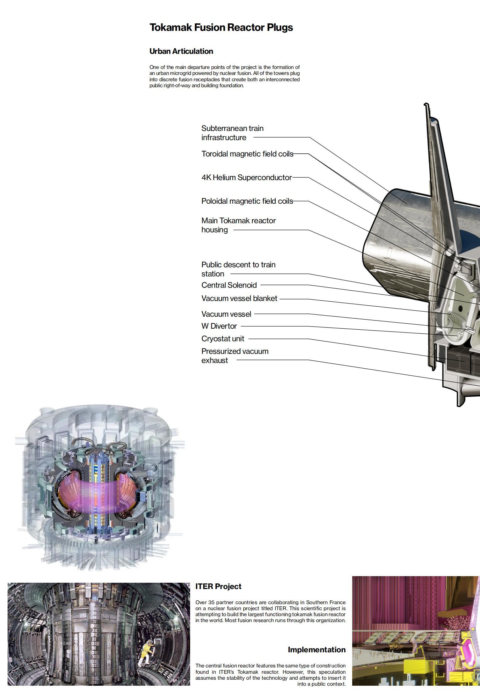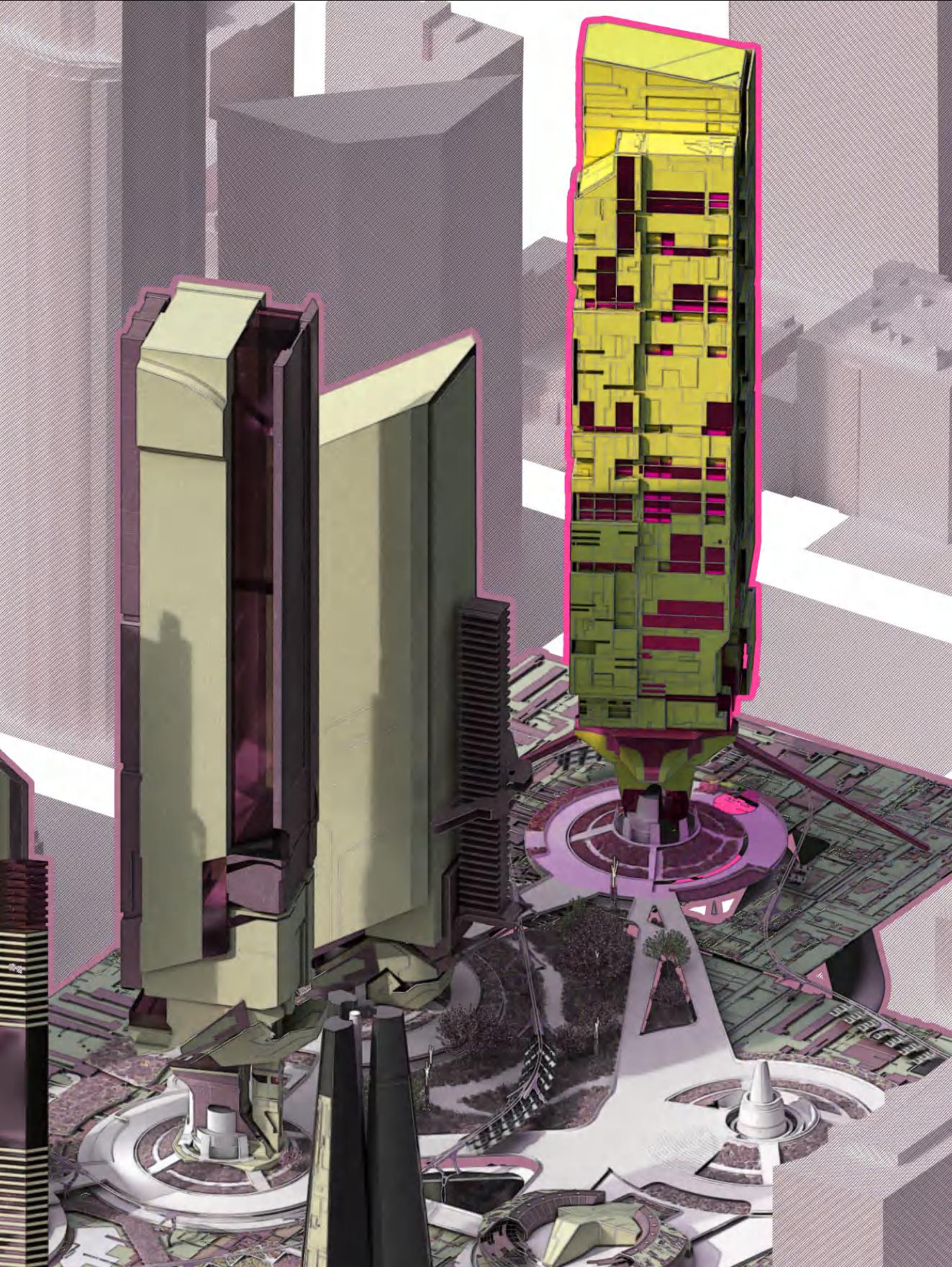 The interstitial space collective towers is imbued with synthetic biomes, formed through the generation of endless energy. These biomes serve as a response to climate change and urban activities as these spaces can be transformed instantly to house a variety of natural and unnatural entities. Elevated paths form a ubiquitous ground plane that connects the towers, weaving between the newurban conglomerate. As an urban assembly, the new microgrid organized around the fusion reactor deploys towers housing one main program. Architecturally, the towers are read as follies; totems of an existing paradigm that begin toform a new reality.