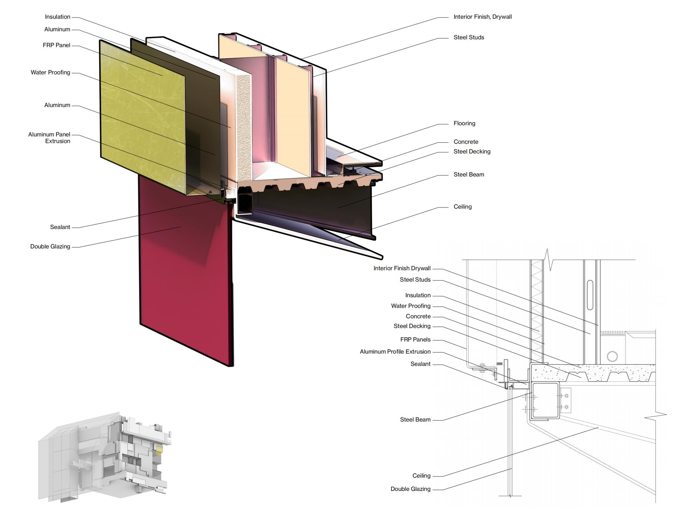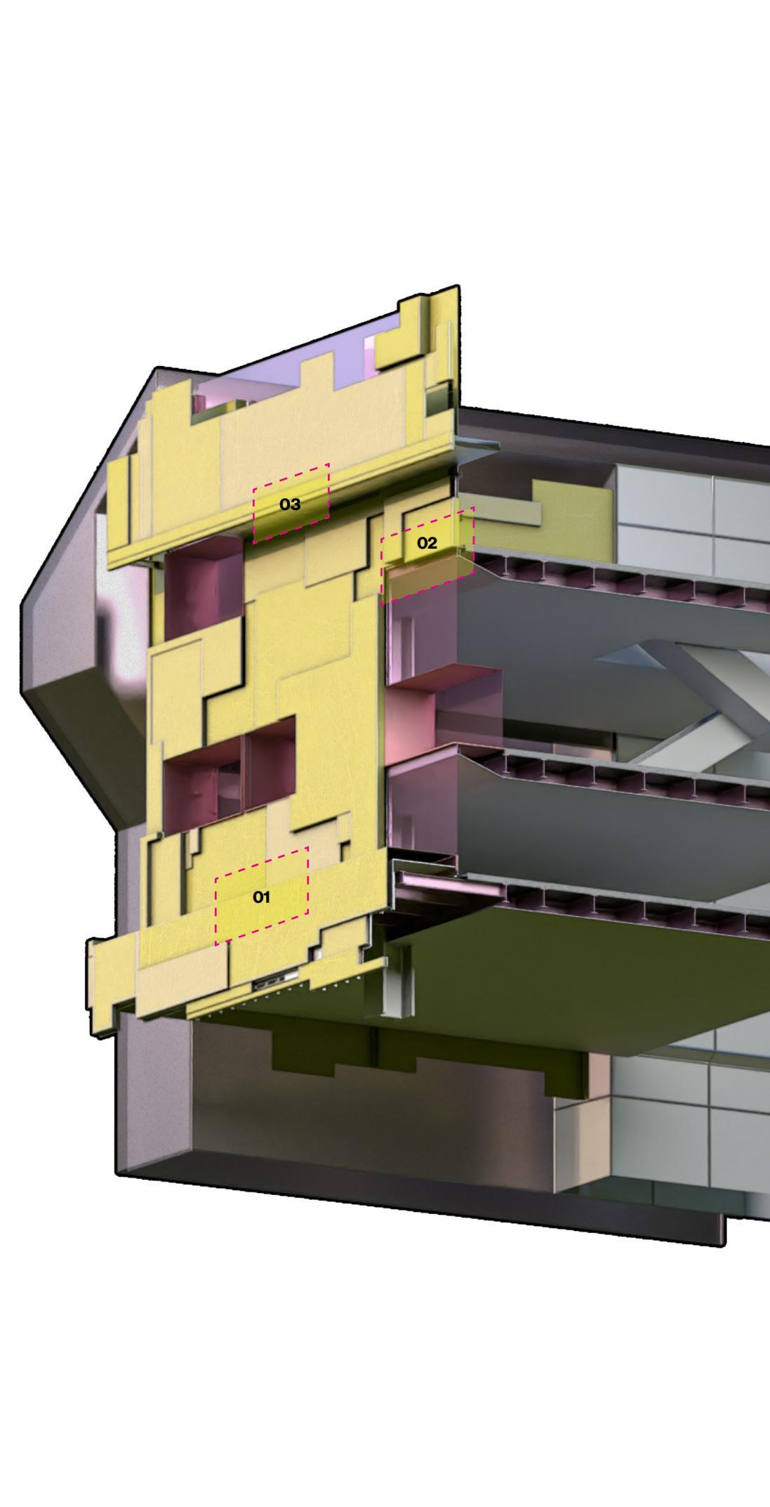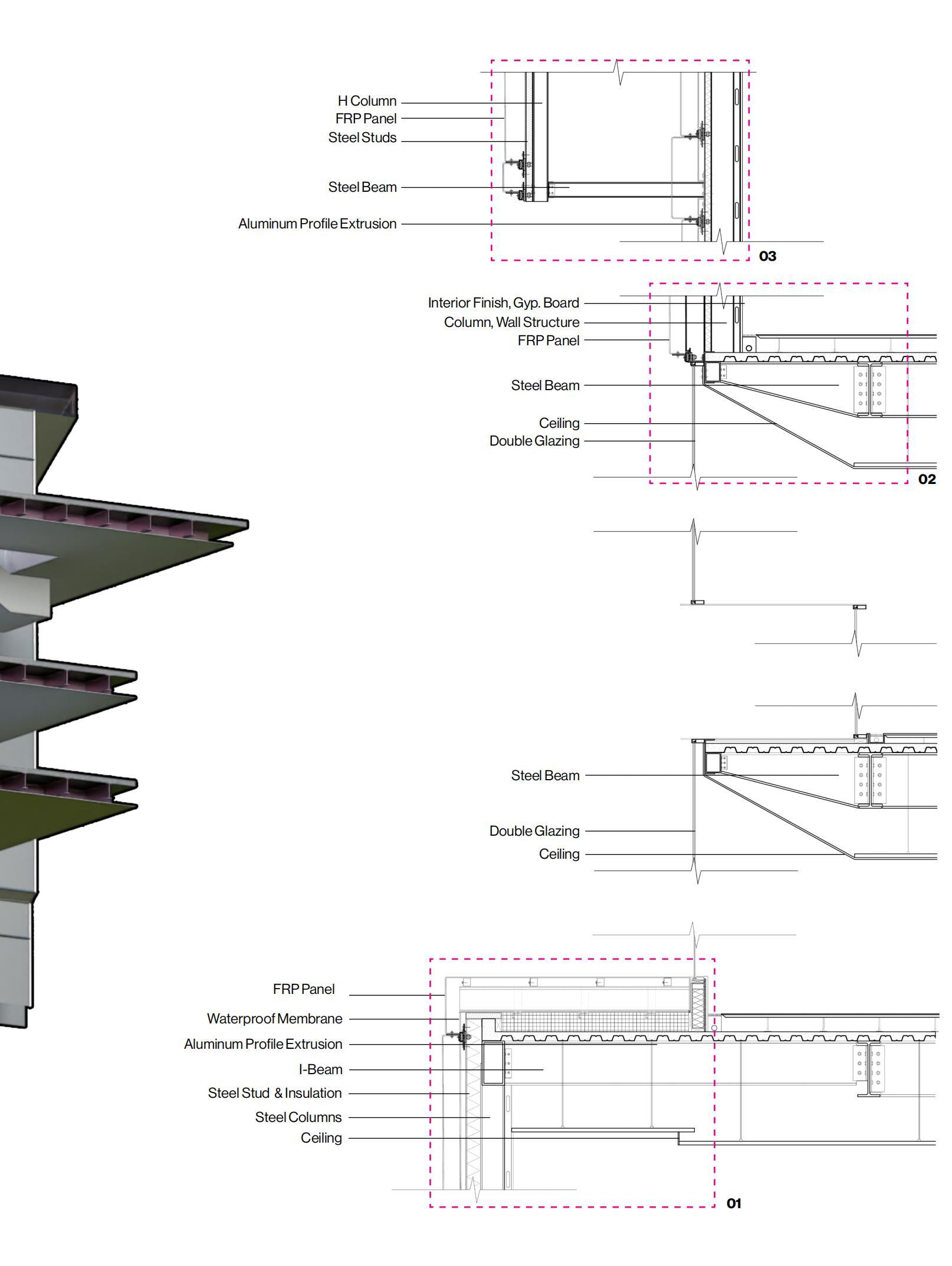 The detailed analysis zoomed in on a building segment featuring various façade systems. It integrated elements such as glass, aluminum panels, and algae pipes, with a design focus on the functionality of the structure and the assembly of the façade components.