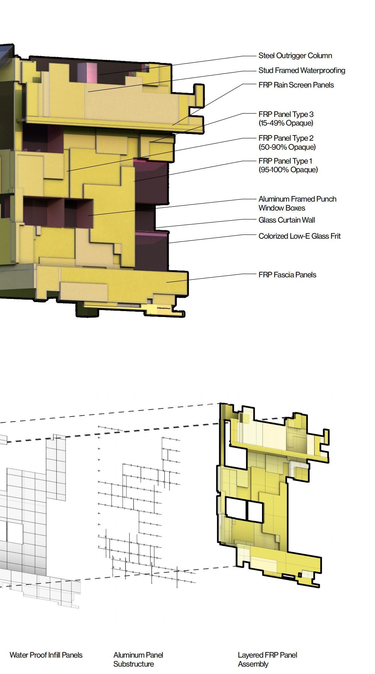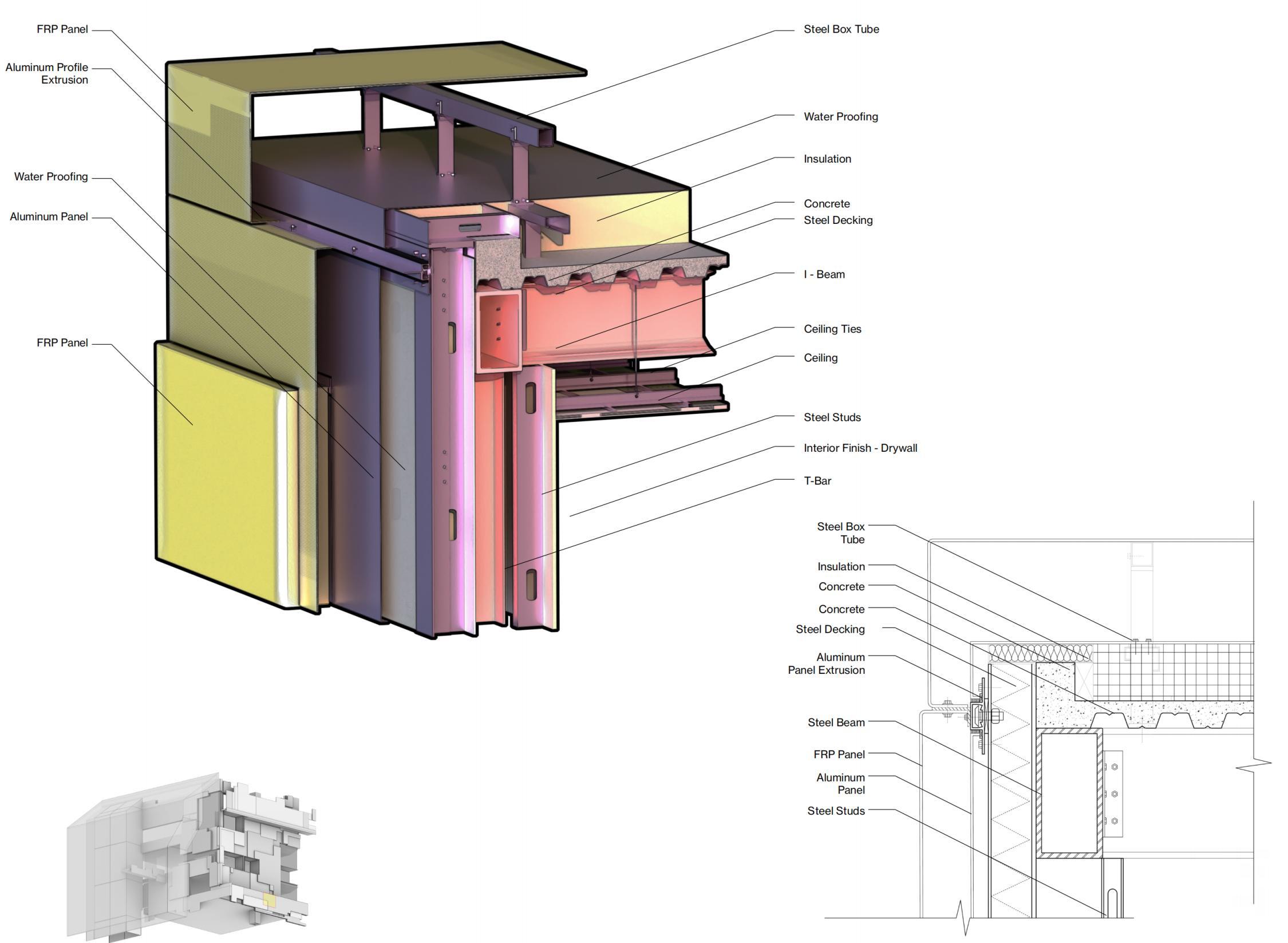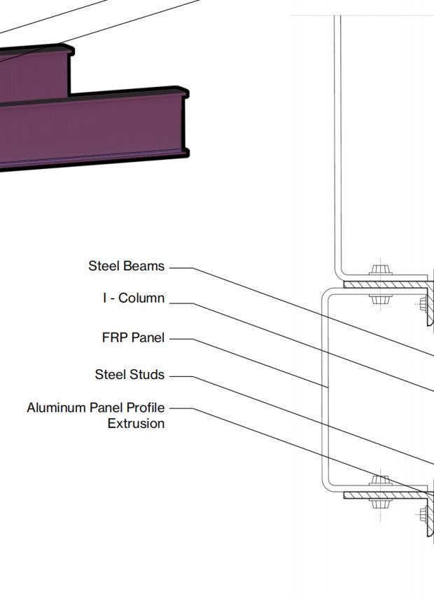 The detailed analysis zoomed in on a building segment featuring various façade systems. It integrated elements such as glass, aluminum panels, and algae pipes, with a design focus on the functionality of the structure and the assembly of the façade components.