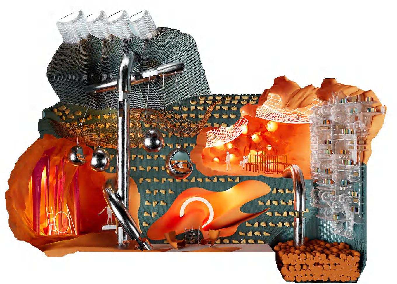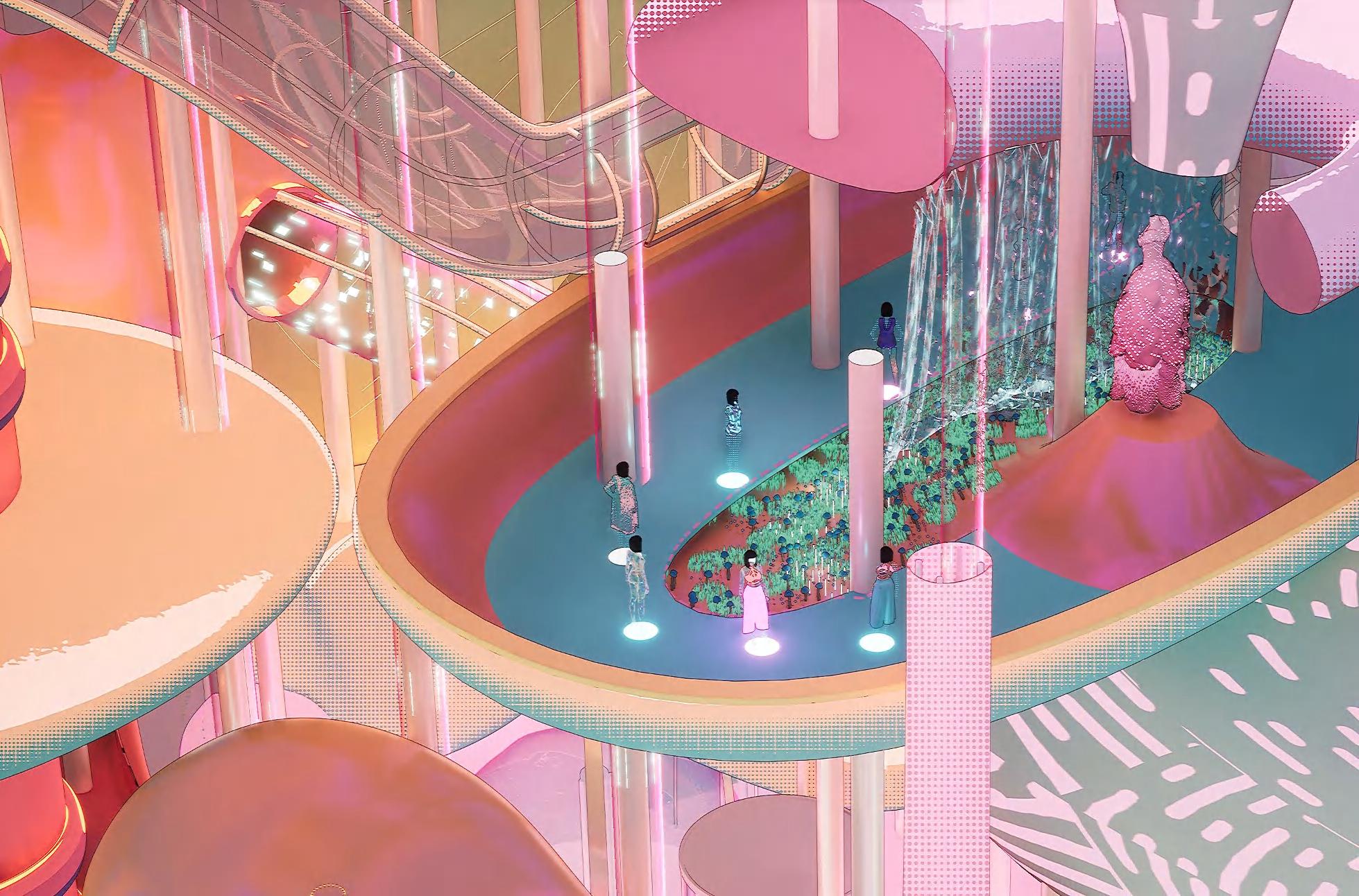 The design process begins by transforming these “Third Form” collages into architectural moments. These artistic inspirations are then woven together with dynamic movements, resulting in a space that is both functional and visually compelling. The final outcome is an architectural experience that blurs the line between art and structure, inviting viewers to interact with the space in new and surprising ways.