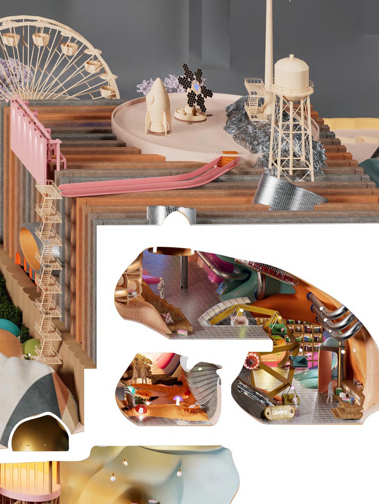 The design process for the library room involved a detailed exploration of sectioning techniques, with a focus on layering. In total, 18 section cuts were utilized to create this space, each with its own distinct materials and colors. To enhance the dynamic nature of the room, a small Ferris wheel was incorporated in the center, adding an element of interest and movement.