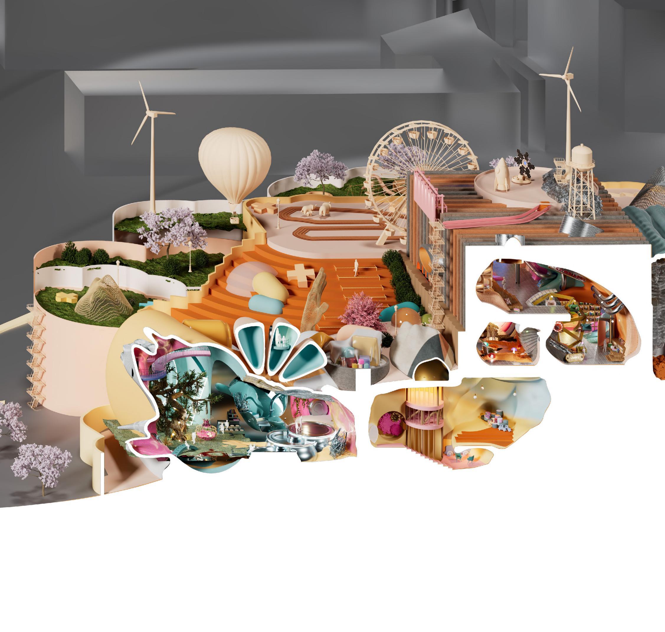 In a related project, we concentrated on designing a playful, functional environment for an elementary school, recognizing the importance of creating spaces that are both safe and stimulating for young minds. Our goal was to design a space that fosters exploration, creativity, and connection with the natural world. The resulting design is lively and imaginative, featuring vibrant colors and whimsical shapes that encourage children to engage with their surroundings. Outdoor areas, such as playgrounds equipped with swings, slides, and climbing structures, provide spaces for physical activity and social interaction. Indoors, the design emphasizes creativity, with areas dedicated to imaginative play and learning. Natural elements, including greenery, sunlight, and open spaces, are thoughtfully integrated to create a harmonious environment that connects children to the world around them. This holistic approach results in a vibrant, inspiring space where children can learn, play, and grow, immersed in an atmosphere that celebrates curiosity and joy.