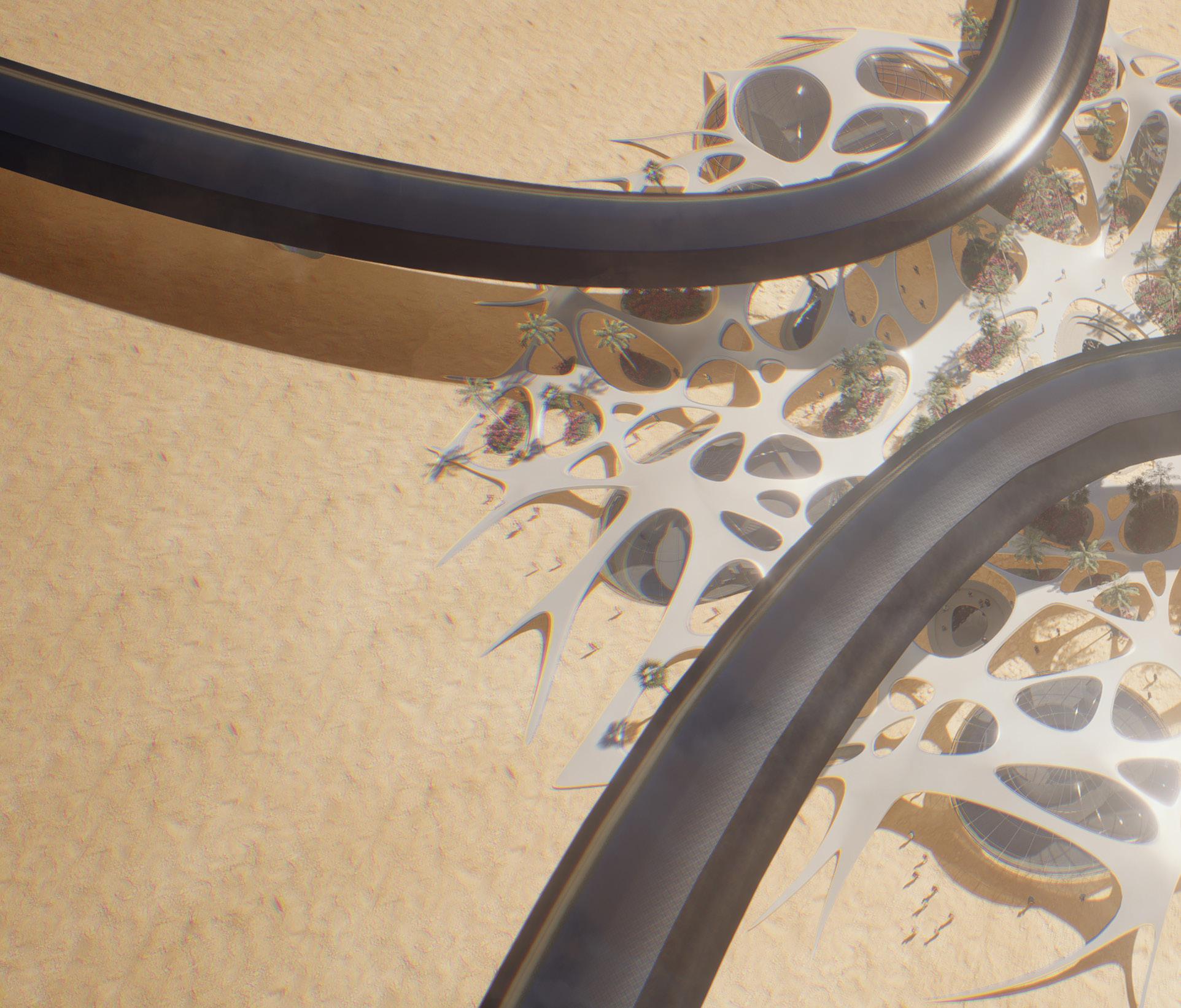 Where there is water, there are cities. Nevada is a desert, a barren environment where water and greenery are hard to find. Therefore, water transported via the Hyperloop will be stored in cisterns, slowly circulating underground before being distributed to specific spaces where it is needed. It could be a cutting-edge and