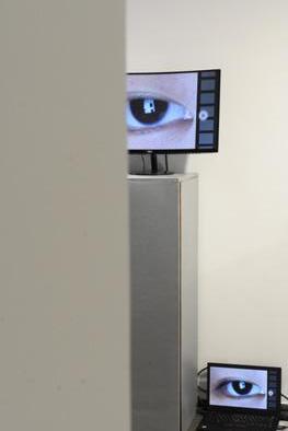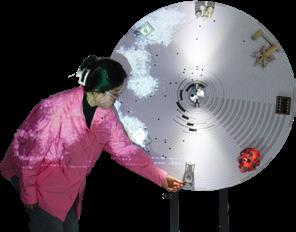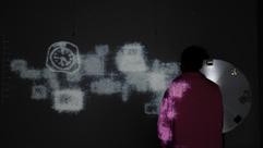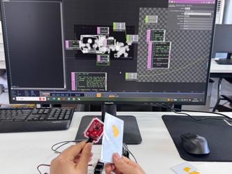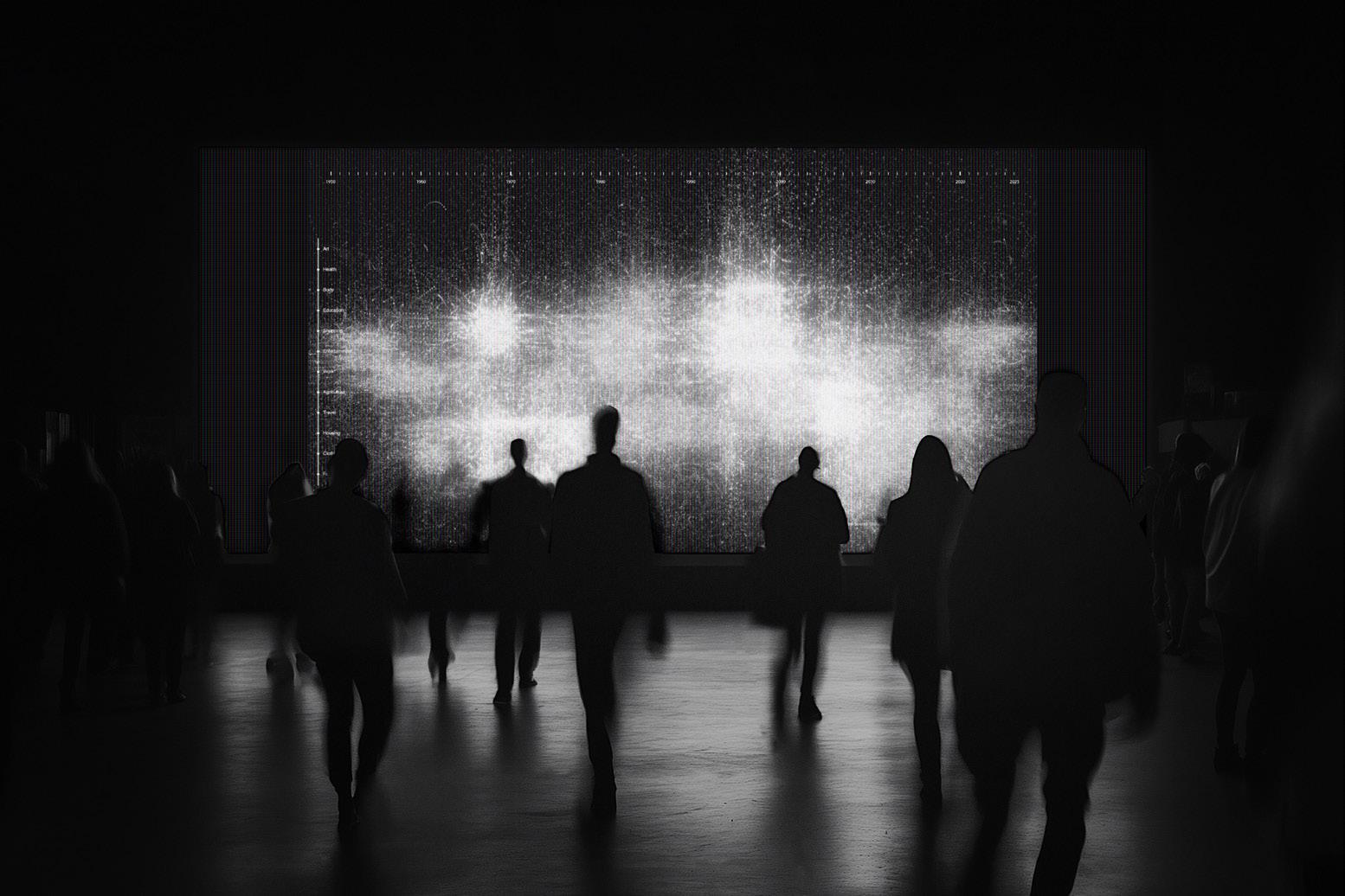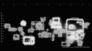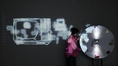 When the ultrasonic sensor detects no presence, on-screen objects deconstruct into transistor particles that pulsate dynamically. When viewed from a distance, this dispersal visualization evokes the fragmentation and disorientation emblematic of the digital age.