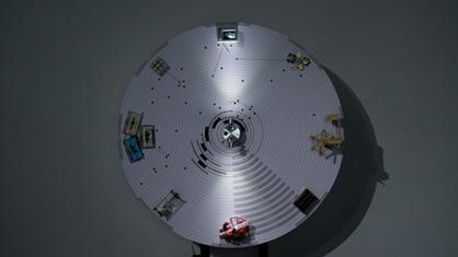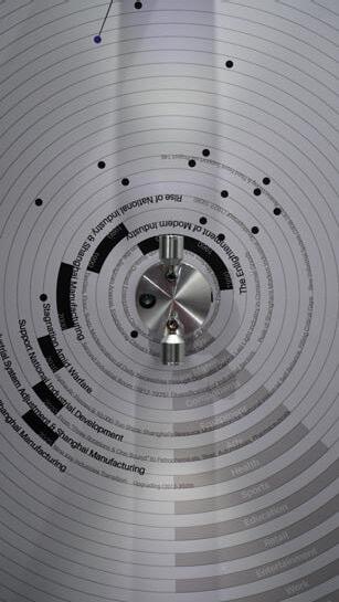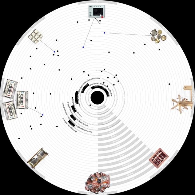 This project delves into industrial music as a key milestone in the digital transformation of the physical world, symbolizing the shift from tangible industry to digital realities. It explores the rebellious spirit of industrial music, which continues to shape how we perceive the evolution of industry and its postmodern sounds, influencing human cognition and existential disorientation in the digital age. Through the integration of sound montage and digital visualization, the project highlights the tension between past and present industrial realities. The installation consists of two interactive parts: a particle graphic visualization and a sound wheel, activated by ultrasonic technology and NFC. Users experience a dual perspective: up close, they encounter familiar objects that resemble past industrial products and sounds, while from afar, they observe current industrial products. The interaction with the wheel transcends time and space, creating a closed loop of industrial parts, guiding reflection on the deeper philosophical questions surrounding technological progress and its impact on human existence.