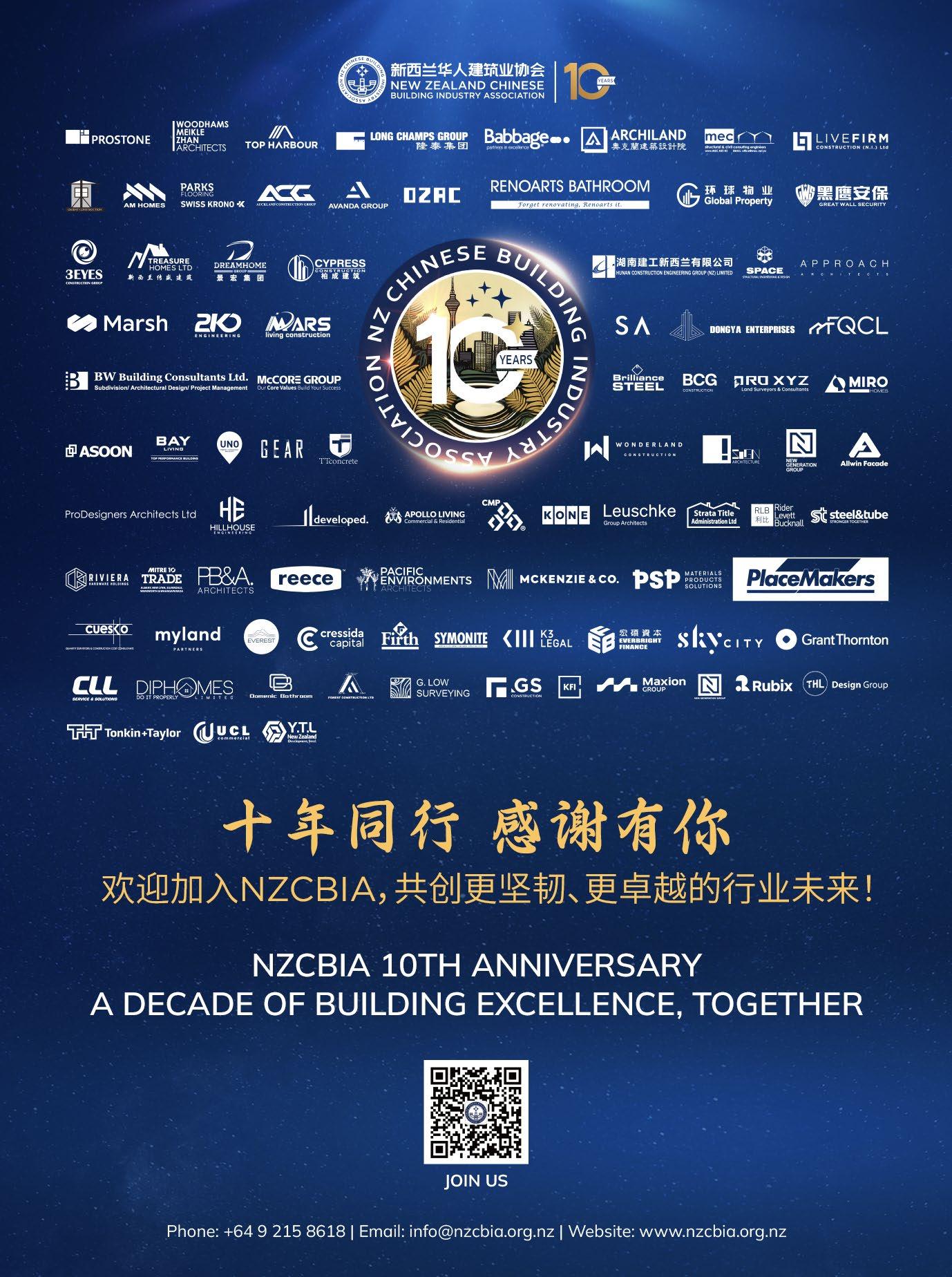 未来尚未抵达,但风已起航。NZCBIA走过了第一个十年,愿与所有为新西兰建筑奉献的人继 续同行,不问终点,只问初心。愿我们在每一块基石中,看见信念,在每一扇窗里,看见希望,在 每一次施工的锤响中,听见国家未来的回声。