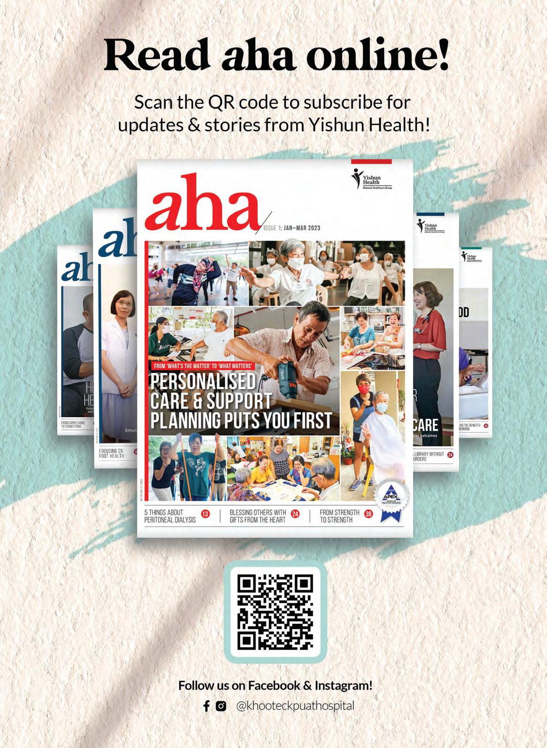 aha is the official quarterly publication of Khoo Teck Puat Hospital (Co. Reg. No. 200717564H) and is produced by ThinkFarm Pte Ltd. All rights to this publication are reserved and no part may be reproduced without the express written consent of the publishers. While every effort has been made to ensure that the information in this newsletter is accurate and up to date, the editorial team will not be responsible for errors due to information received. Opinions expressed are that of the writers and do not necessarily represent the views and opinions of the publishers. Printed by Mainland Press Pte Ltd. MCI (P) 054/06/2024