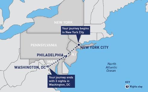 •One-way Amtrak® in Coach accommodations from Boston to New York, New York to Philadelphia, Philadelphia to Washington, D.C. on the Northeast Regional® • 8 nights’ hotel accommodations Washington, DC