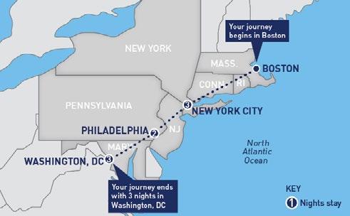 •One-way Amtrak® in Coach accommodations from Boston to New York, New York to Philadelphia, Philadelphia to Washington, D.C. on the Northeast Regional® • 8 nights’ hotel accommodations Washington, DC
