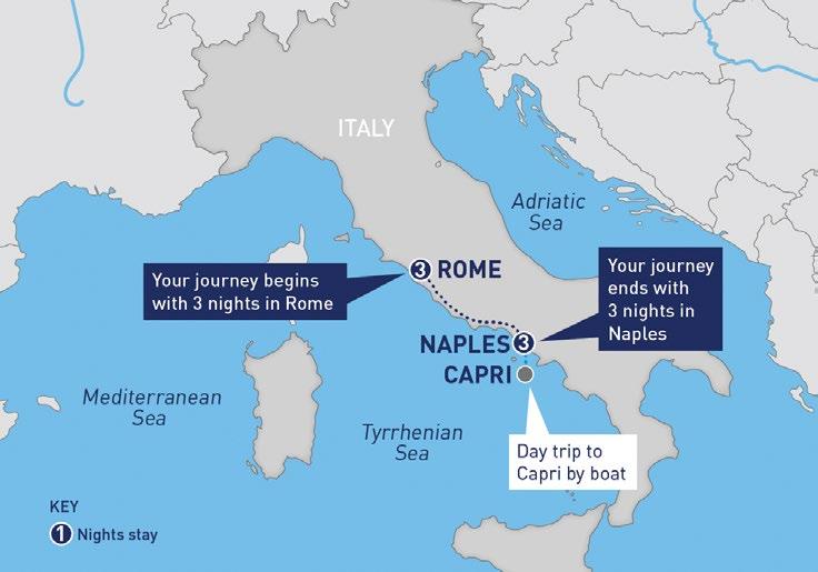 • Explore the Colosseum and Roman Forum in Rome, and discover Capri and the Blue Grotto.