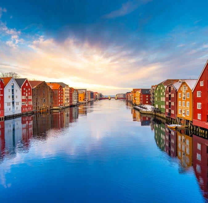 Dock in Trondheim and take time to explore its historic streets, Gothic cathedral, and riverside cafés. In the afternoon, sail past scenic islets and lighthouses en route to Rørvik.
