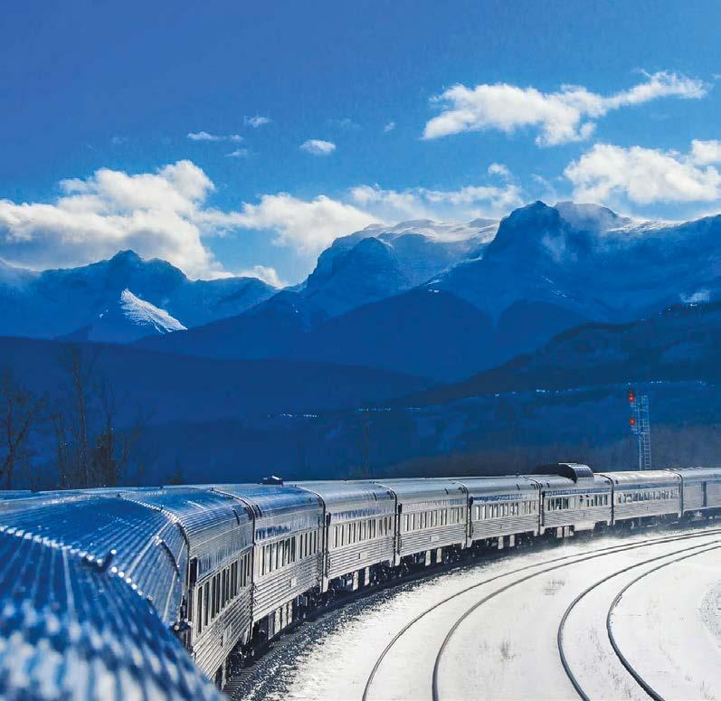 Experience the splendor of the Canadian Rockies while traveling on two scenic trains, the Rocky Mountaineer and VIA Rail