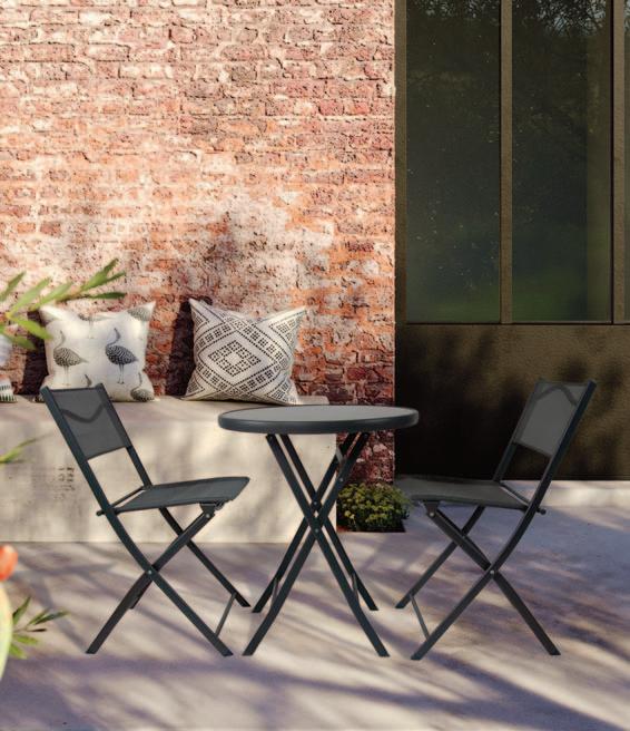 Set compuesto de 2 sillas plegables de metal 46x51xH85 cm. Mesa 60x70 cm. Superficie de cristal templado 4 mm. Gris oscuro/Negro.