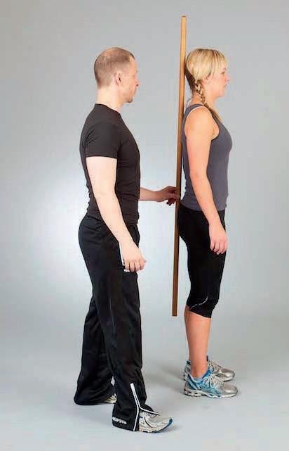 The upper back and neck should also have curves so that when a dowel rod is placed on the tailbone it should make contact just between the shoulder blades and the back of the head at the base of the skull. Some clients will not feel comfortable actually having a stick placed on their back in this way, but some will see the benefits of the feedback it supplies to them and to you as a trainer.