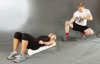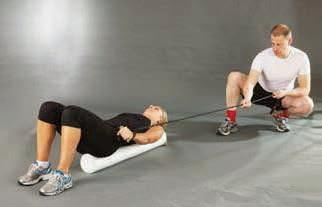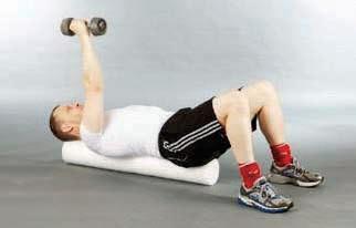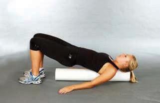 lie supine with palms facing one another, shoulder width apart and forearms resting on a foam roller