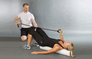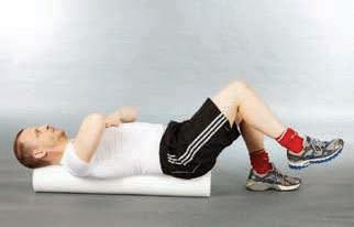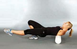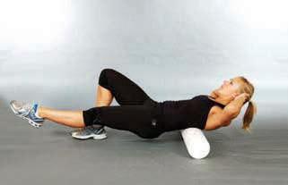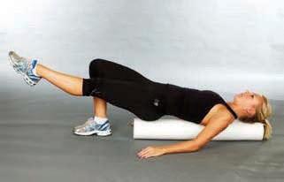 the soles of the feet are comfortably placed on the floor with the knees bent lift the hips from the roller about two centimetres into a low bridge position