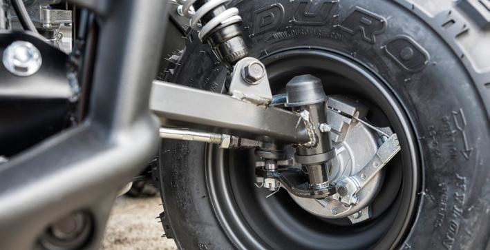 Het geavanceerde hybride chassis combineert een stalen voorgedeelte met een aluminium achtergedeelte en een demonteerbaar subframe om een supersterke structuur te vormen die bestand is tegen alle schokken en stoten. De lichte achterbrug van gegoten aluminium wordt afgeveerd door een verstelbare schokdemper met geoptimaliseerde dempinginstellingen. Dit levert een comfortabele en regelbare besturing op.