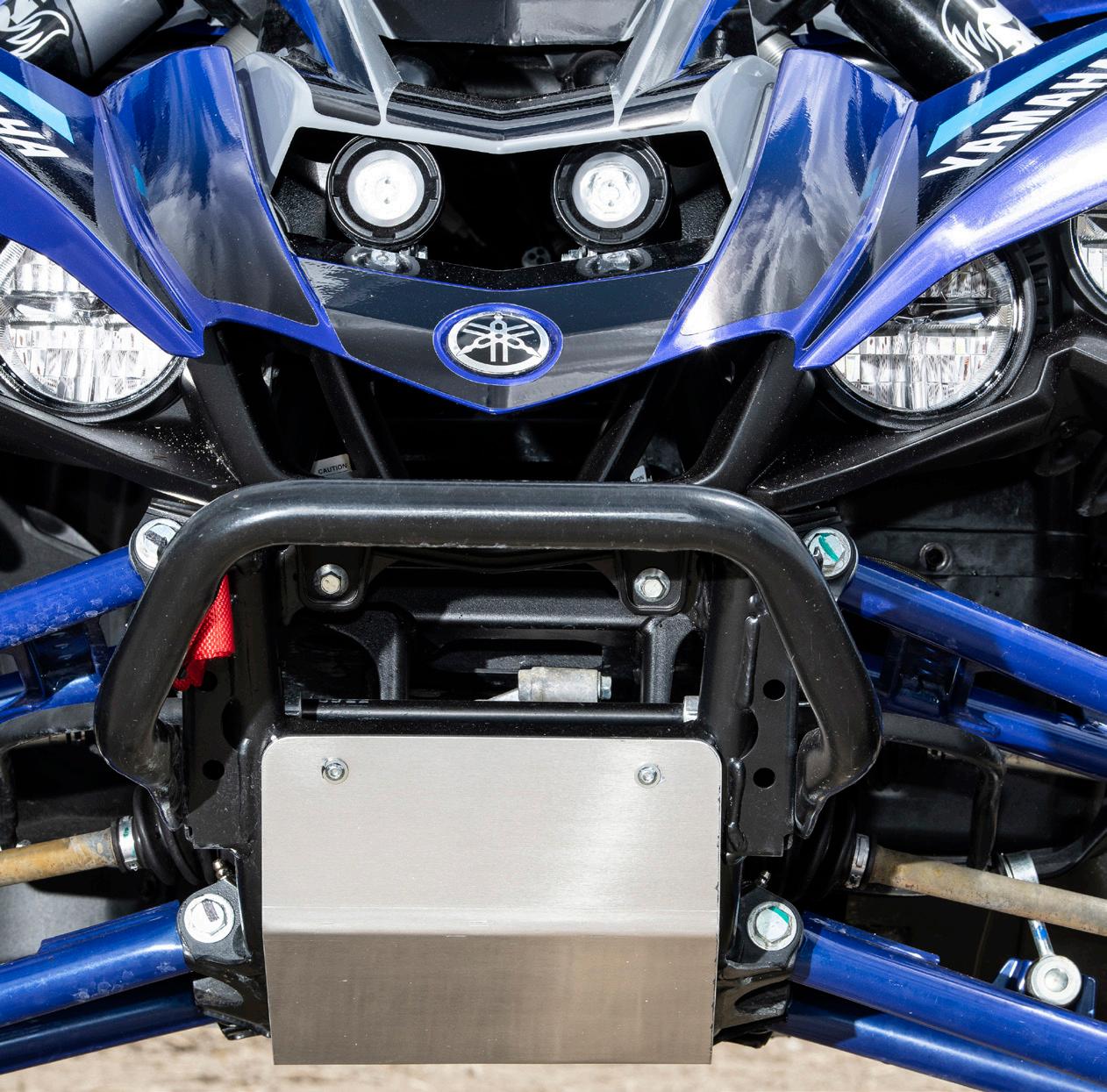 De YFM700R SE in Yamaha Black is uitgerust met speciale SE voetplaten en een SE grab bar. De YFM700R SE in Racing Blue beschikt over standaard voetplaten en een standaard grab bar.