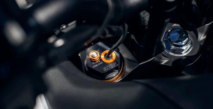 Les suspensions électroniques avant et arrière entièrement réglables sont régies par la centrale inertielle (IMU) à six axes et l’ECU qui ajustent instantanément les réglages d’amortissement via un électro-aimant d’assurer un pilotage souple et sûre, quelle que soit la charge ou les conditions de conduite. Les différents modes sont accessibles depuis l’interface du tableau de bord TFT.