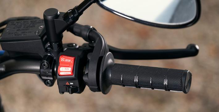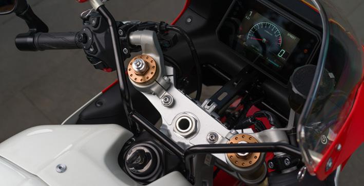 De gegoten aluminium voetsteunen zijn beschikbaar in twee posities, boven en onder. De posities van de voetsteunen zijn aangepast aan de sportievere ergonomie, zodat ze passen bij de nieuwe zitpositie en het verlaagde, clip-on stuur.