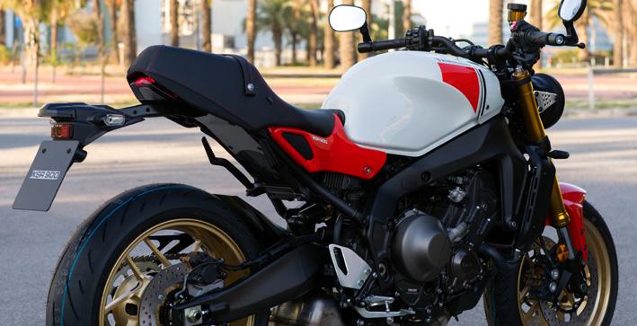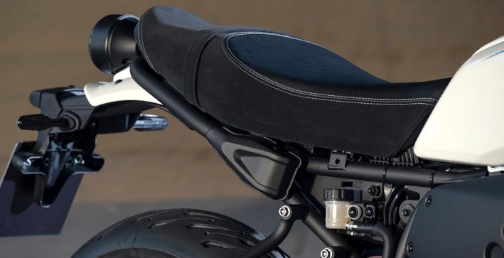 Het nieuw ontworpen, comfortabele hoofdzadel is ontworpen met de stijl van racers uit de jaren 80 en 90 in gedachten. Er zijn gesloten zijpanelen onder het zadel toegevoegd om de race-uitstraling met halve kuip voort te zetten. De panelen zijn bevestigd met D-ringen in racestijl die snel en gemakkelijk kunnen worden verwijderd. De zadelhoes zit over de passagiersruimte en kan worden verwijderd als een passagier meerijdt.