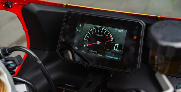 Een nieuw 5-inch TFT-kleurenscherm is ondergebracht in de cockpit in retro-stijl. Je kunt kiezen uit vier displaythema’s die passen bij verschillende rijervaringen, waaronder een toerenteller in analoge stijl, geïnspireerd op racemotorfietsen van weleer. Voor een verrijkte rijervaring is smartphoneconnectiviteit standaard ingebouwd op de XSR900 GP, zodat je tijdens het rijden verbonden kunt blijven door je smartphone te koppelen met je motorfiets via de My Ride-app.