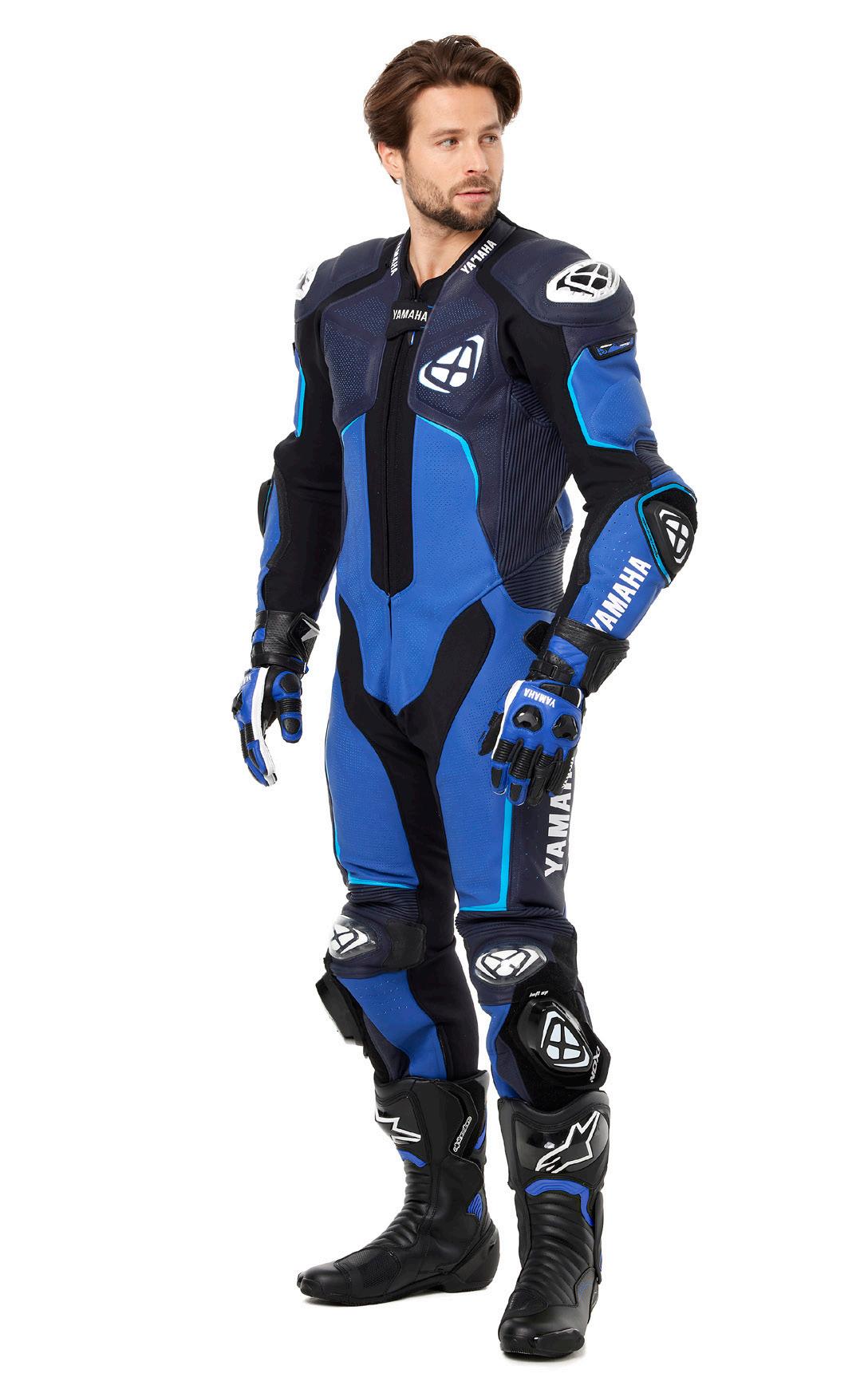 Het lederen racepak uit de R-serie is exclusief voor Yamaha vervaardigd door Ixon. Dit product van topkwaliteit is ontworpen voor Supersport-rijders die een hoog niveau van bescherming met een dynamische stijl eisen. De met Aramid versterkte arm- en beenstukken en de afneembare elleboogen kniebeschermers en de slanke externe beschermers op de schouders bieden een hoog beschermingsniveau op de weg en op het circuit. Dit CE-goedgekeurde pak biedt uitzonderlijk rijcomfort met uitstekende ventilatie dankzij de micro-geperforeerde stukken aan de voorzijde en de voorgevormde stukken voor lichaam, armen en knieën.