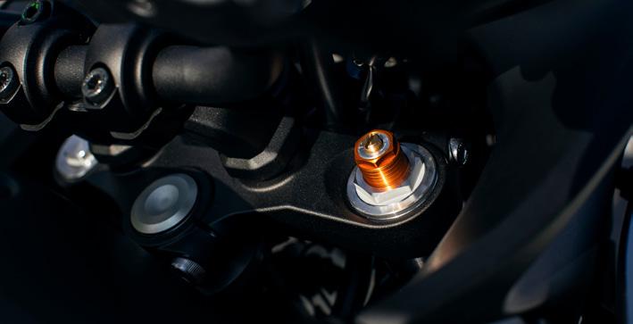 Les suspensions électroniques avant et arrière entièrement réglables sont régies par la centrale inertielle (IMU) à six axes et l’ECU qui ajustent instantanément les réglages d’amortissement via un électro-aimant d’assurer un pilotage souple et sûre, quelle que soit la charge ou les conditions de conduite. Les différents modes sont accessibles depuis l’interface du tableau de bord TFT.
