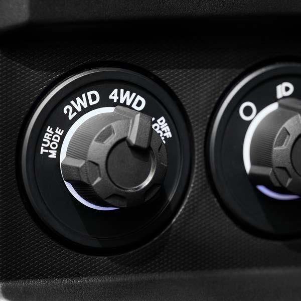 Oprócz trybów 2WD/4WD i blokady mechanizmu różnicowego On Command oferuje również tryb Turf.Tryb Turf odblokowuje tylny mechanizm różnicowy, zapewniając mniejszy promień skrętu i zmniejszając uszkodzenia darni. Trawo, możesz odetchnąć z ulgą, jesteś bezpieczna!