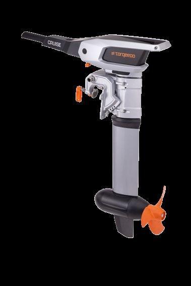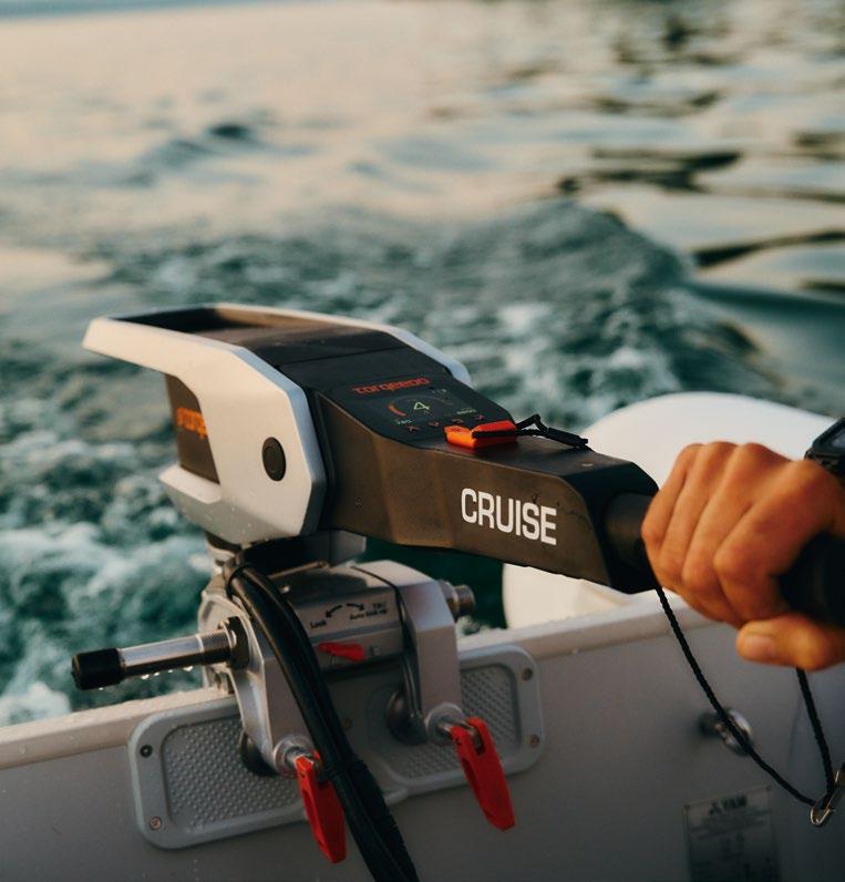 The Cruise 10.0 T is equipped with a tiller and a 48-volt outboard motor with a 20 HP equivalent, making it ideal for boats up to 10 tons. Choose between short, long, or extra-long shaft lengths. All Cruise systems have a built-in GPS with on-board computer and display with speed and input power, state of charge and remaining range. Due to its advanced helical gear design, the pylon is compact, low-resistance, and lightweight.