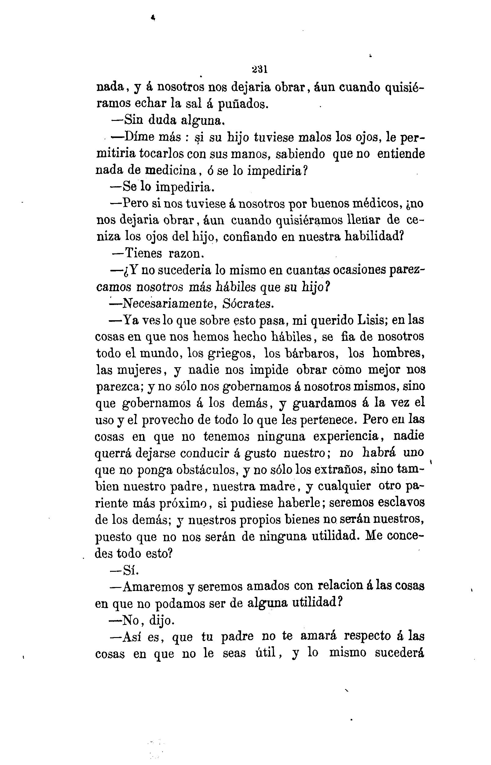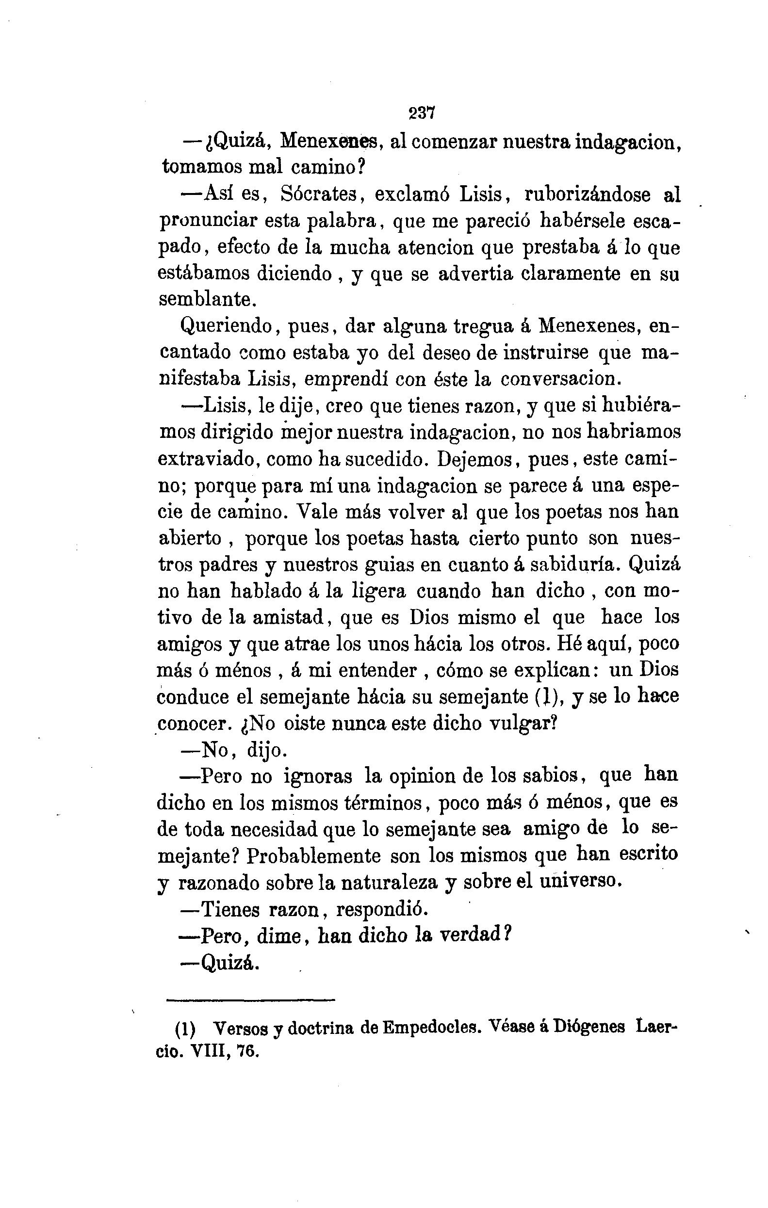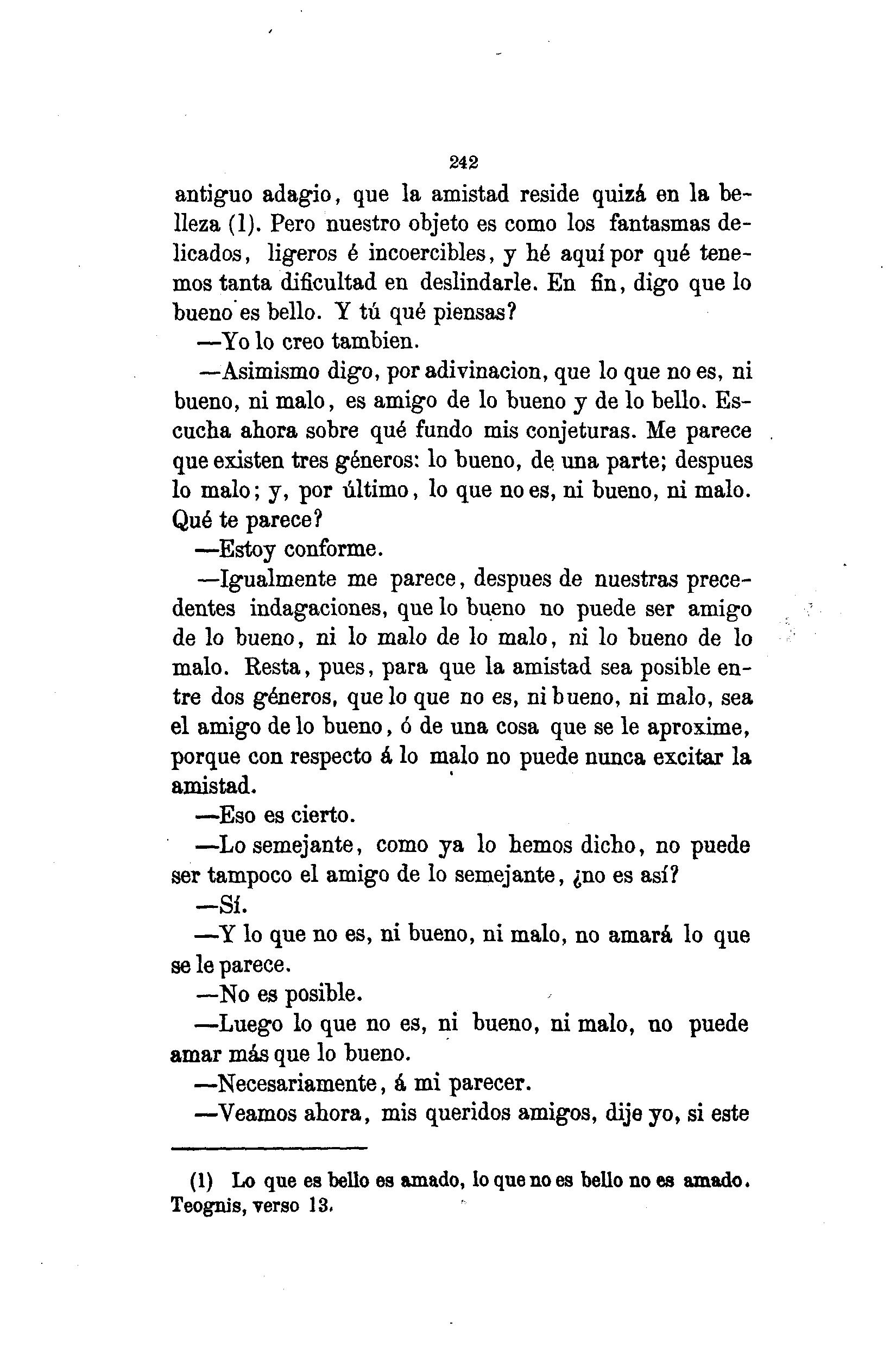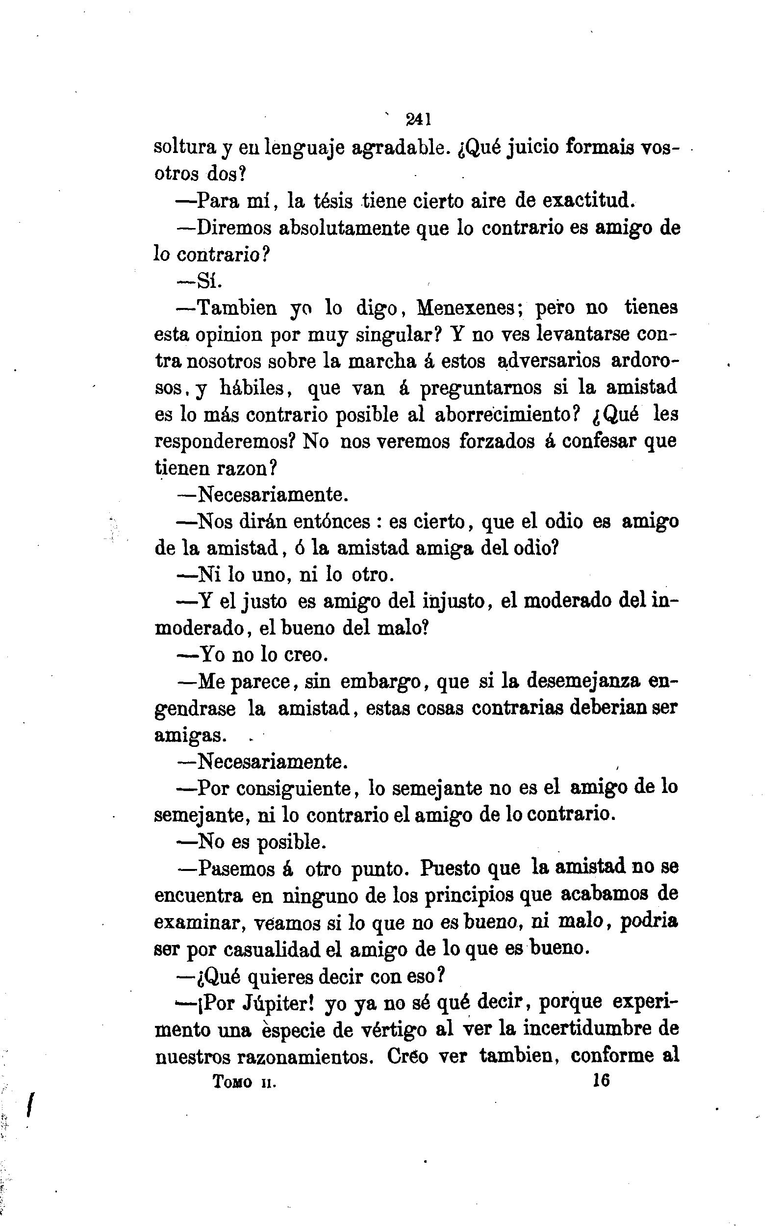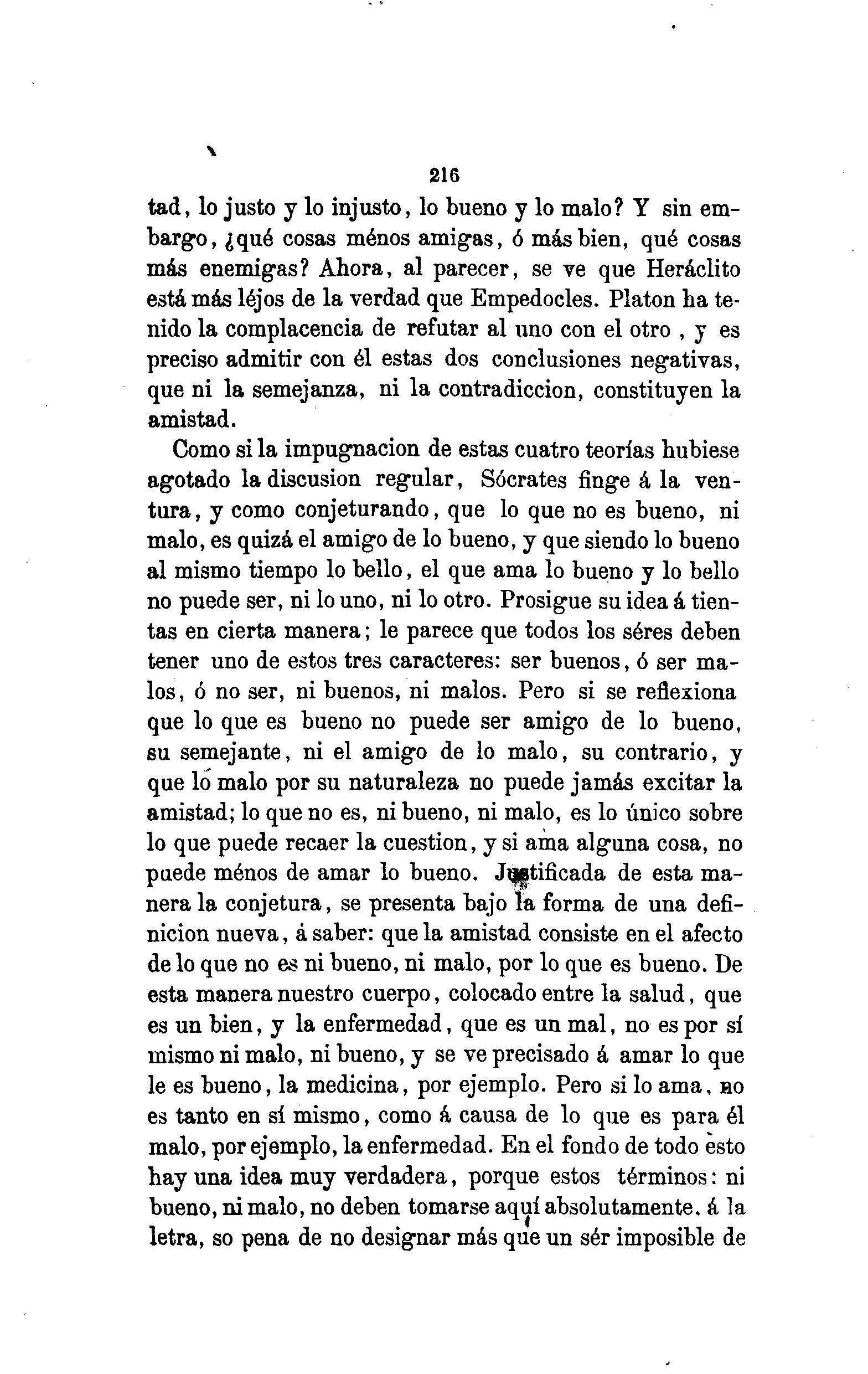 —Hé aquí, mis queridos jóvenes, que hemos vuelto á las primeras opiniones sobre la amistad, á las que ya hemos rechazado, porque lo injusto se hace amigo de lo injusto, como lo malo delo malo, y lo bueno de lobueno.