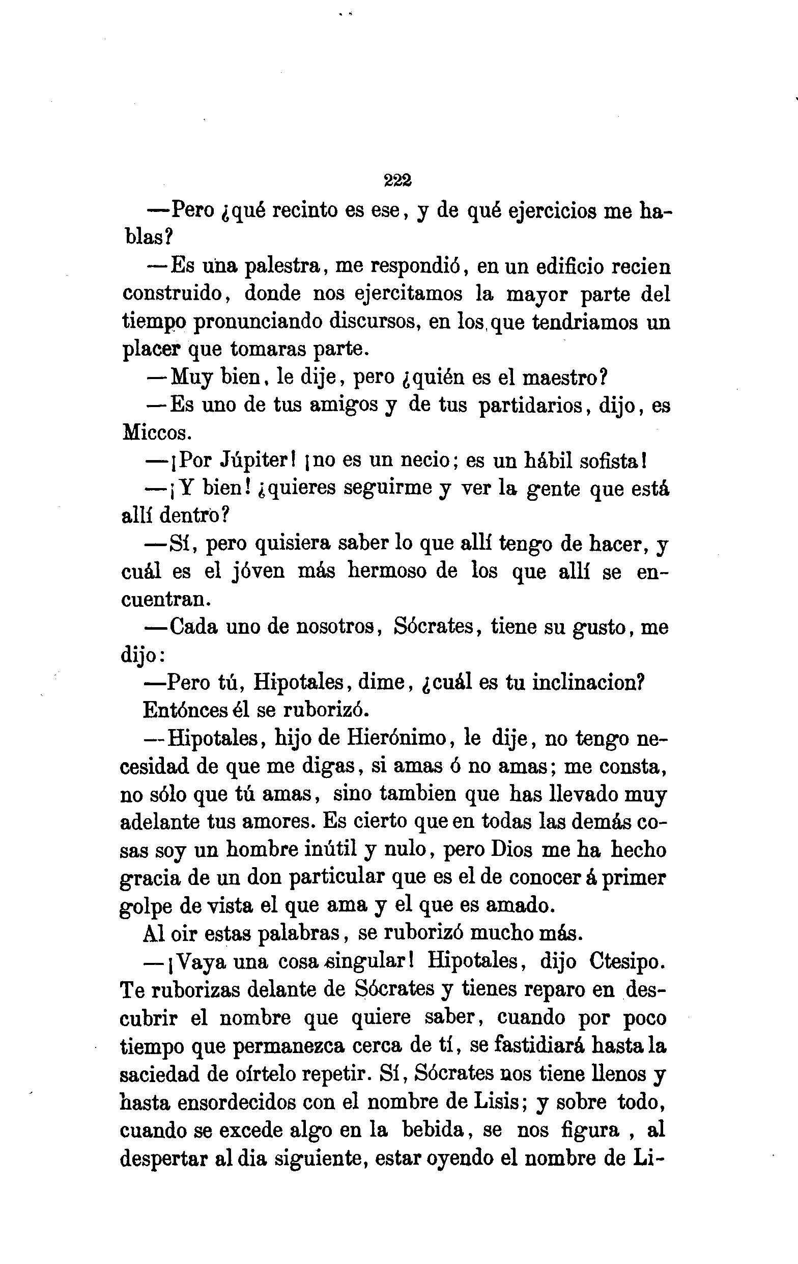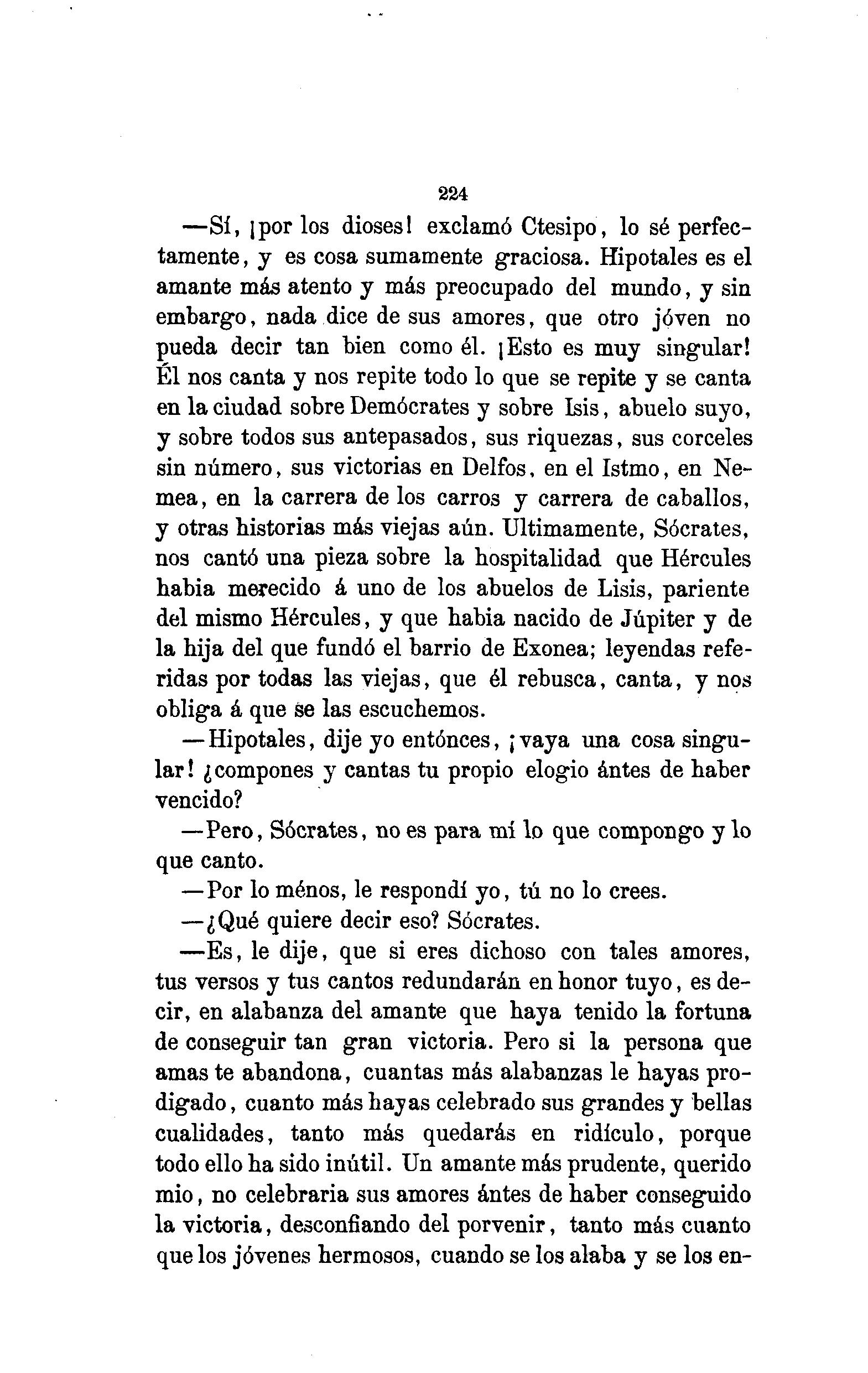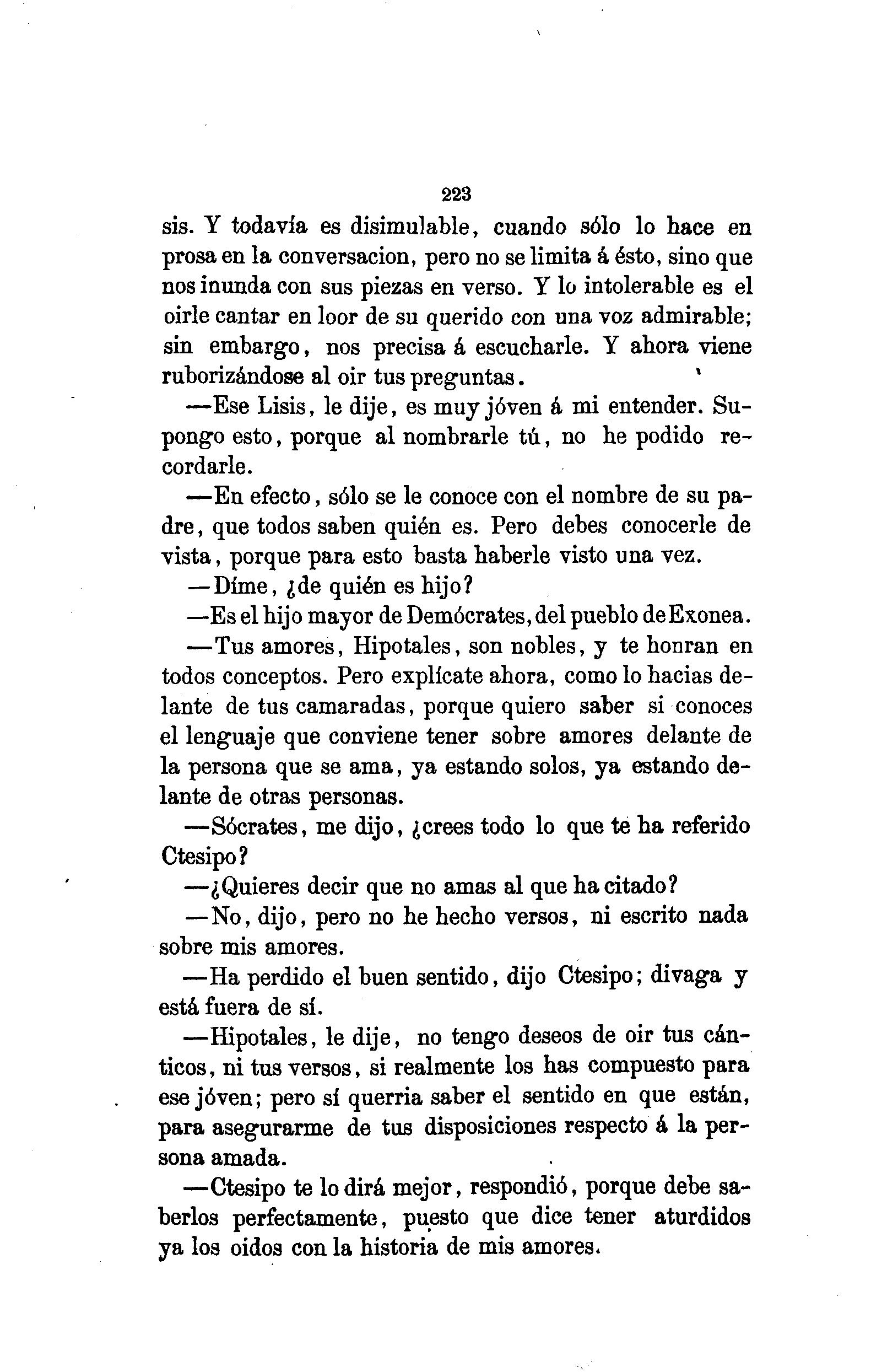 —Hipotales, le dije, no tengo deseos de oir tus cánticos, ni tus versos, si realmente los has compuesto para esejoven; pero sí querría saber el sentido en que están, para asegurarme de tus disposiciones respecto á la persona amada.