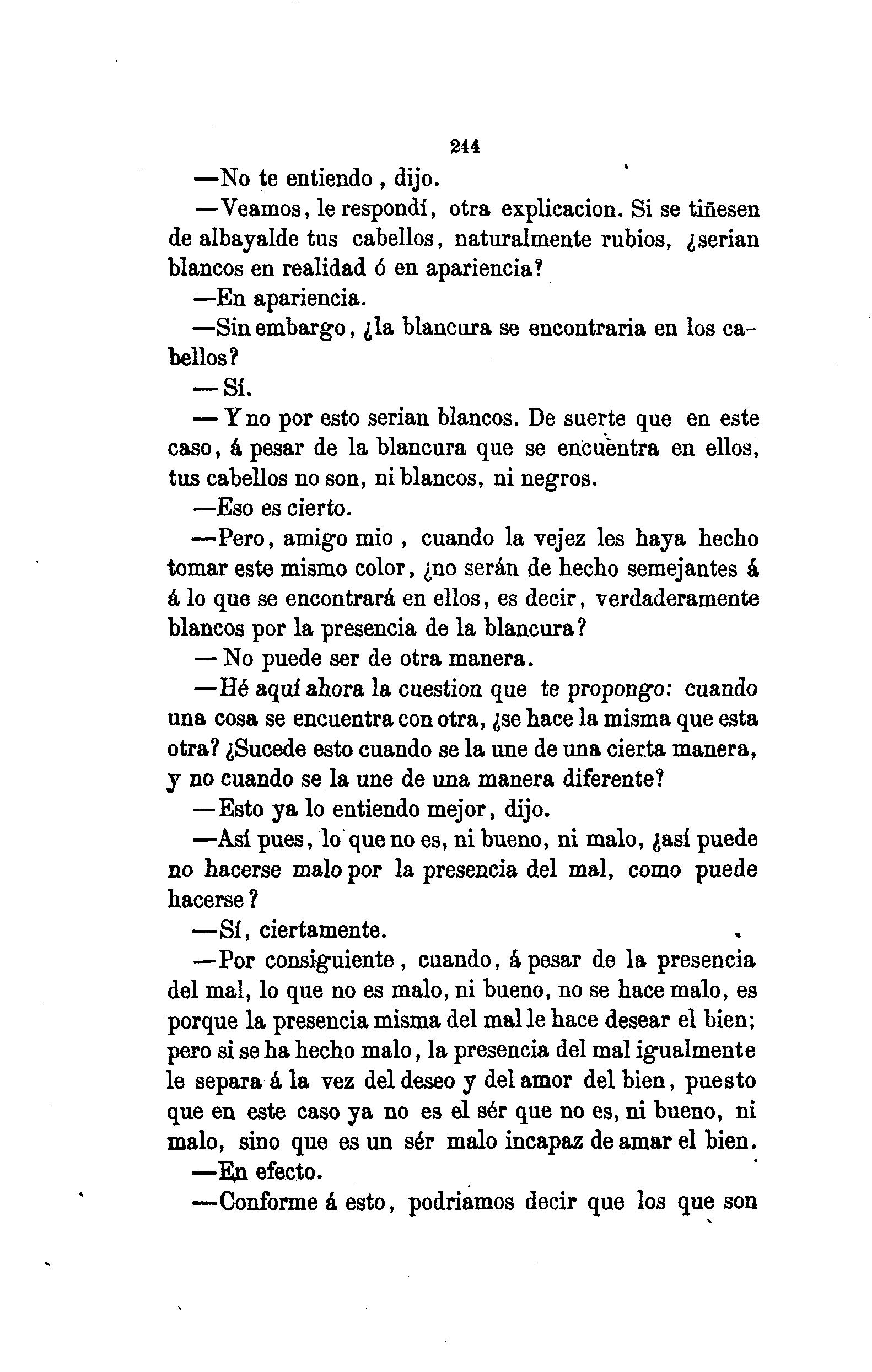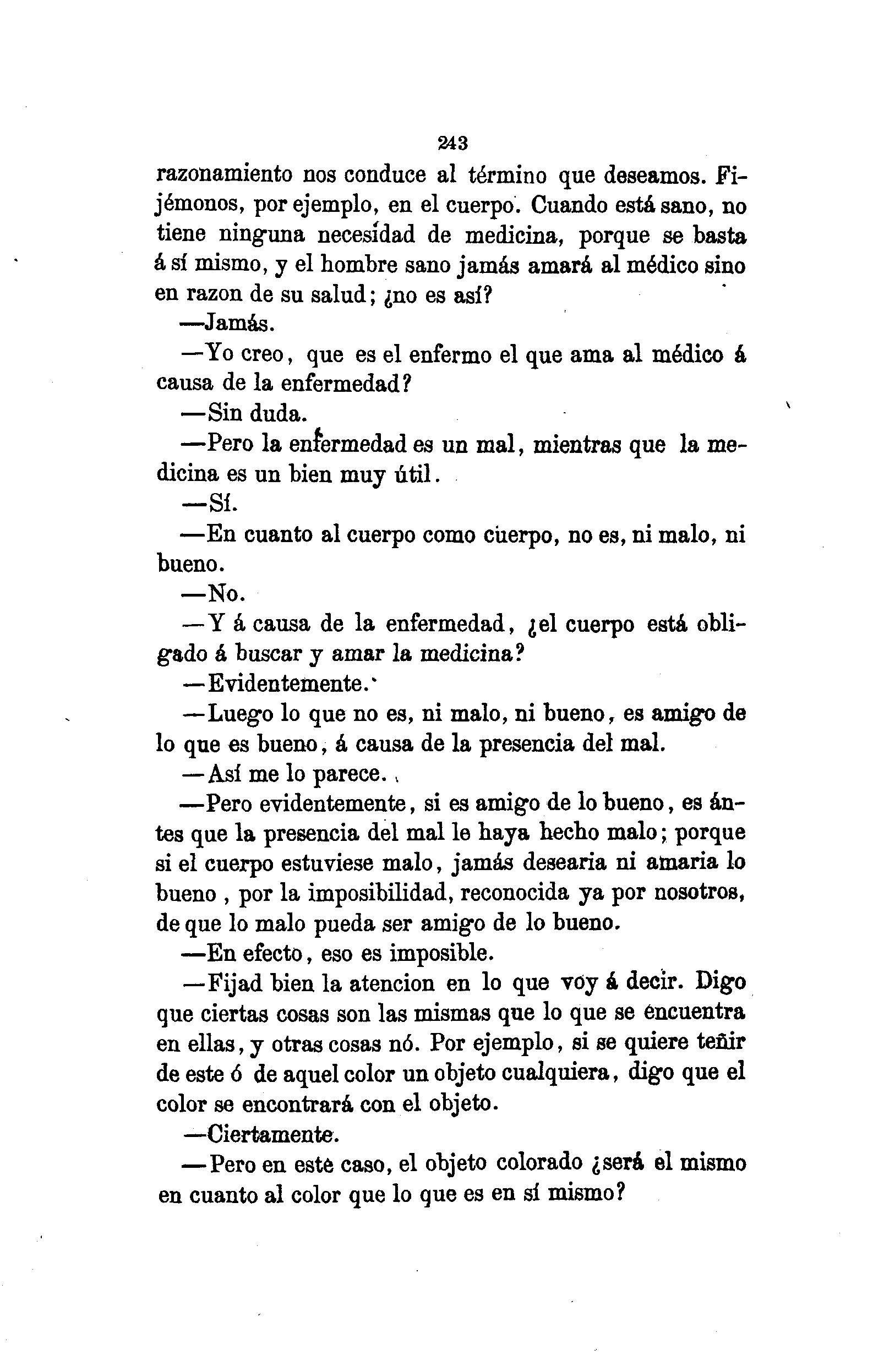 —Pero la enfermedad es un mal. ¿Cómo no? y la salud ¿esun bien ó un mal, ó noes, nilo uno, ni lo otro?