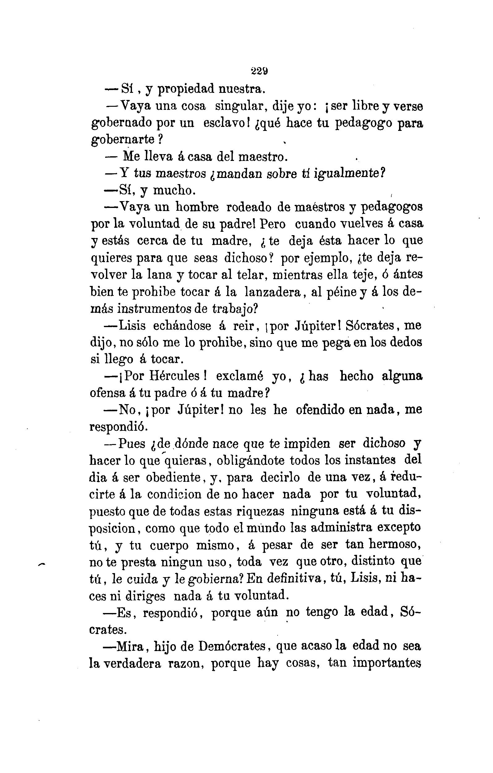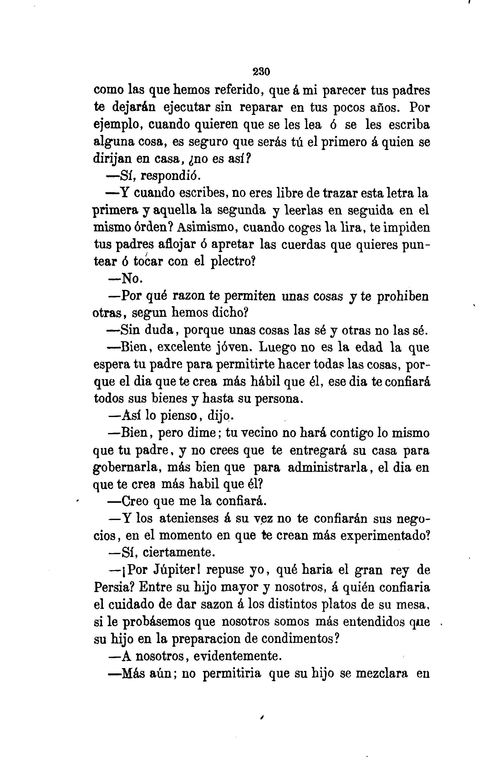 —Tus padres, á lo que veo, hacen más casode un esclavo que de tí, que eres su hijo, puesto que le confian, con preferencia á ti, lo que les pertenece, y le permiten hacer lo que quiere en el acto mismo que te lo prohiben á tí. Pero dime aún; ¿te dejan en libertad de conducirte por tí mismo?