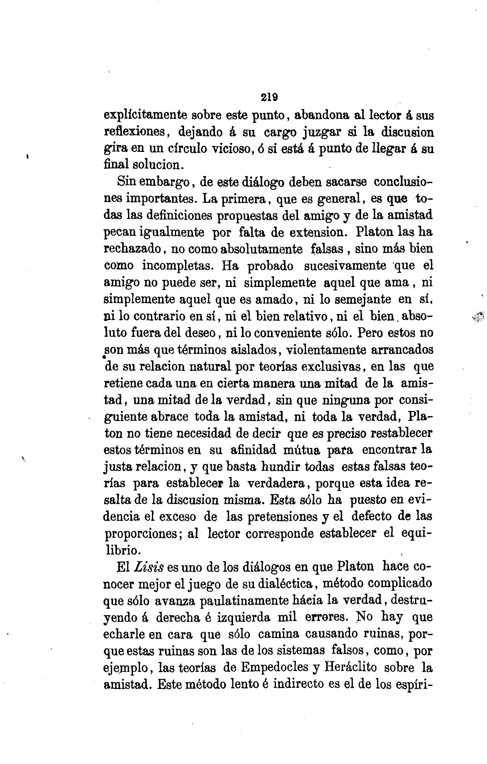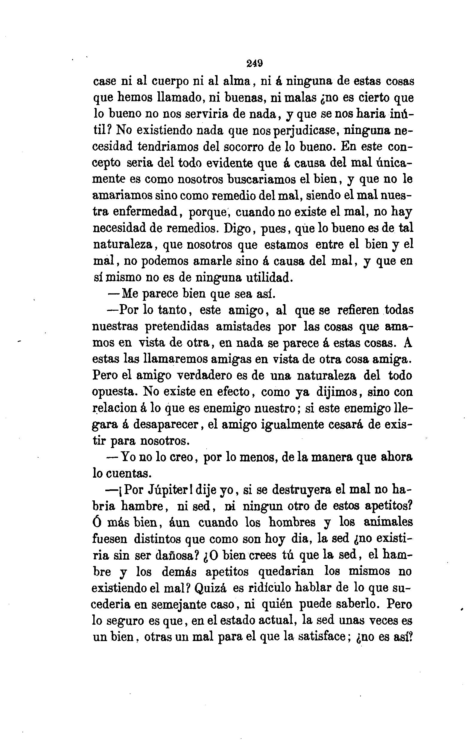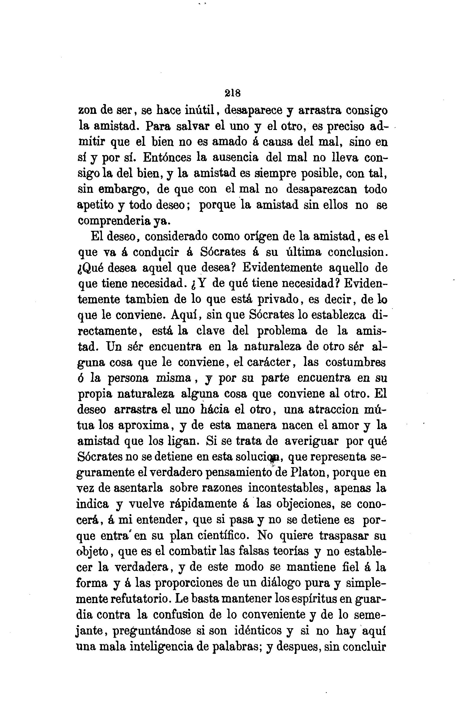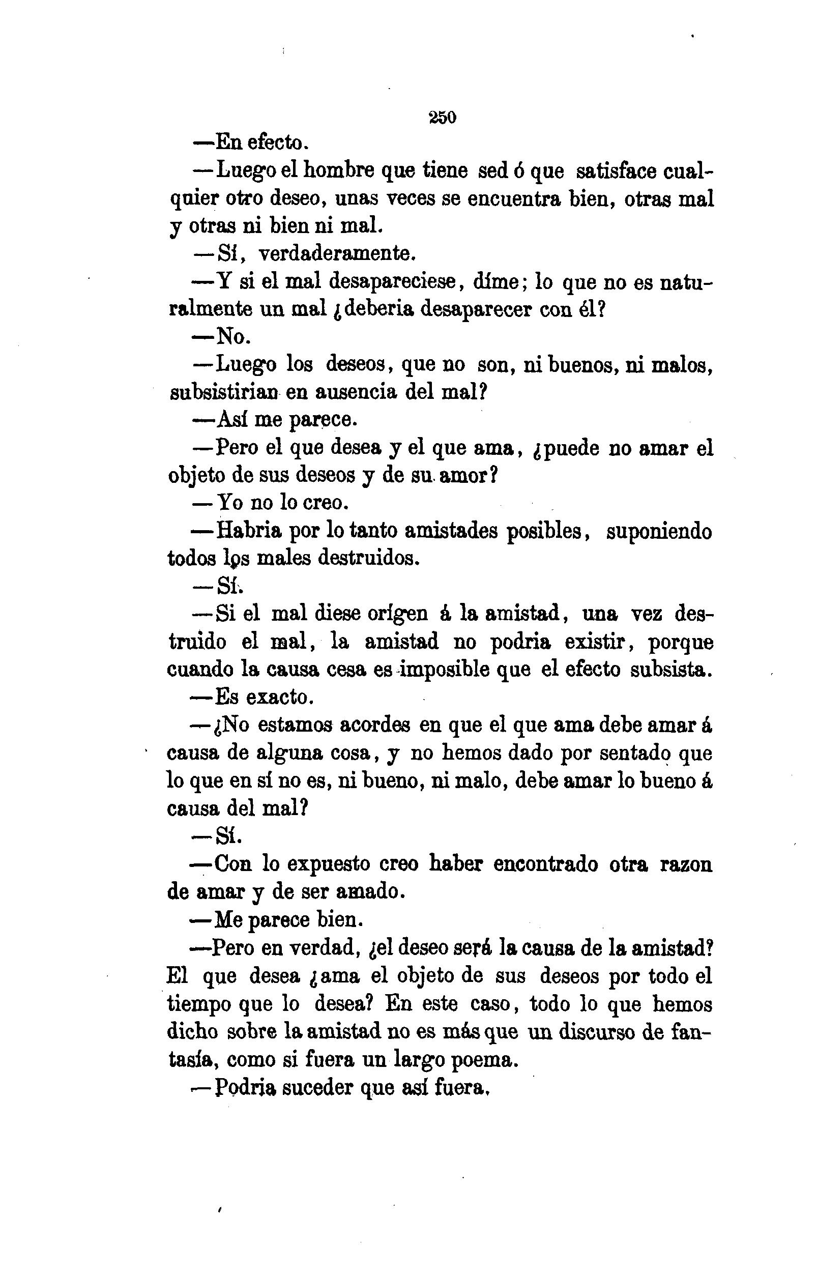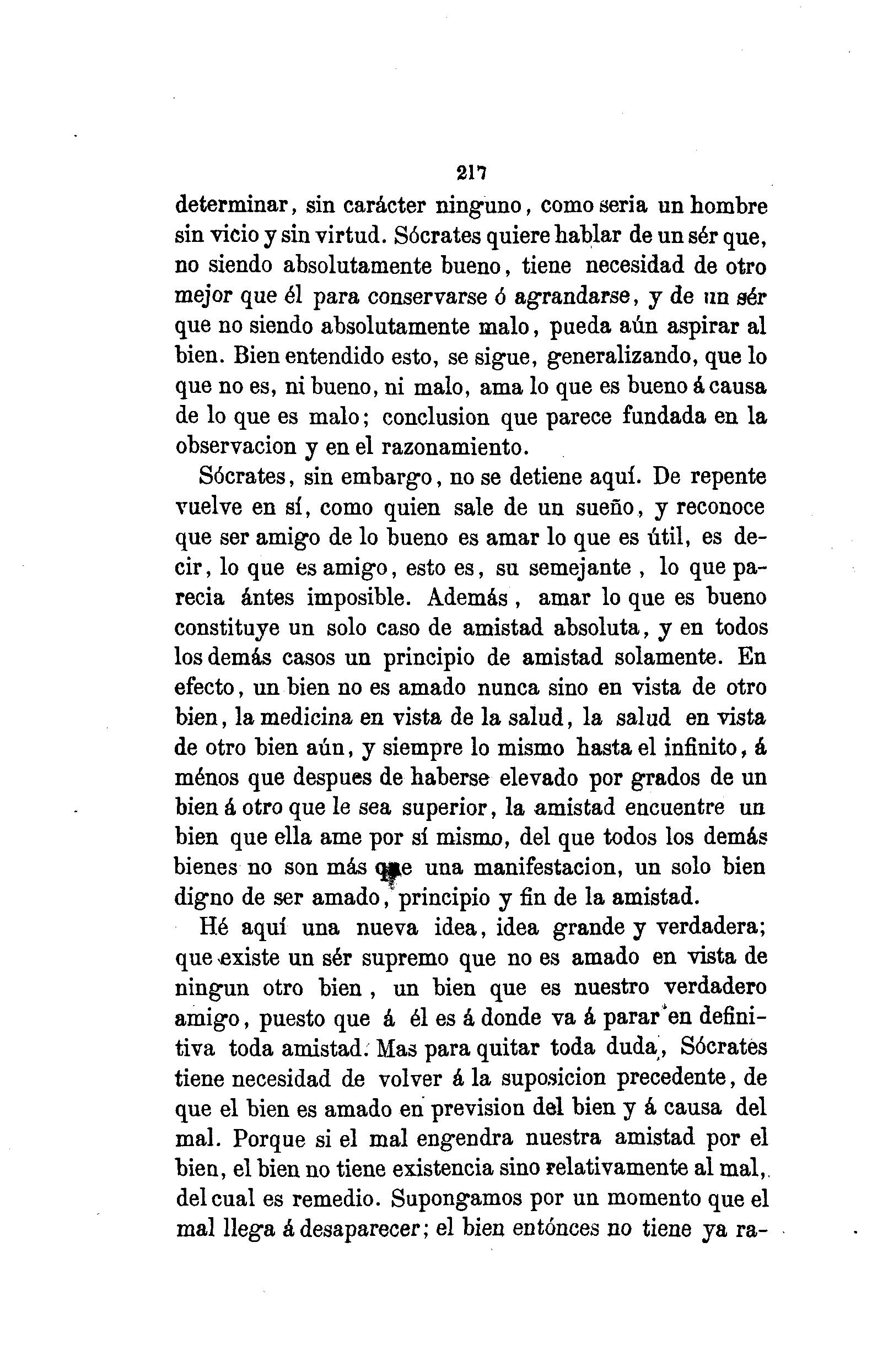 —Apliquemos este razonamiento á la amistad, y digamos que todas las cosas que llamamos amigas, amándolas en vista de otra cosa, no merecen este nombre; no hay más amigo que ese principio á que se refieren todas nueátras pretendidas amistades.