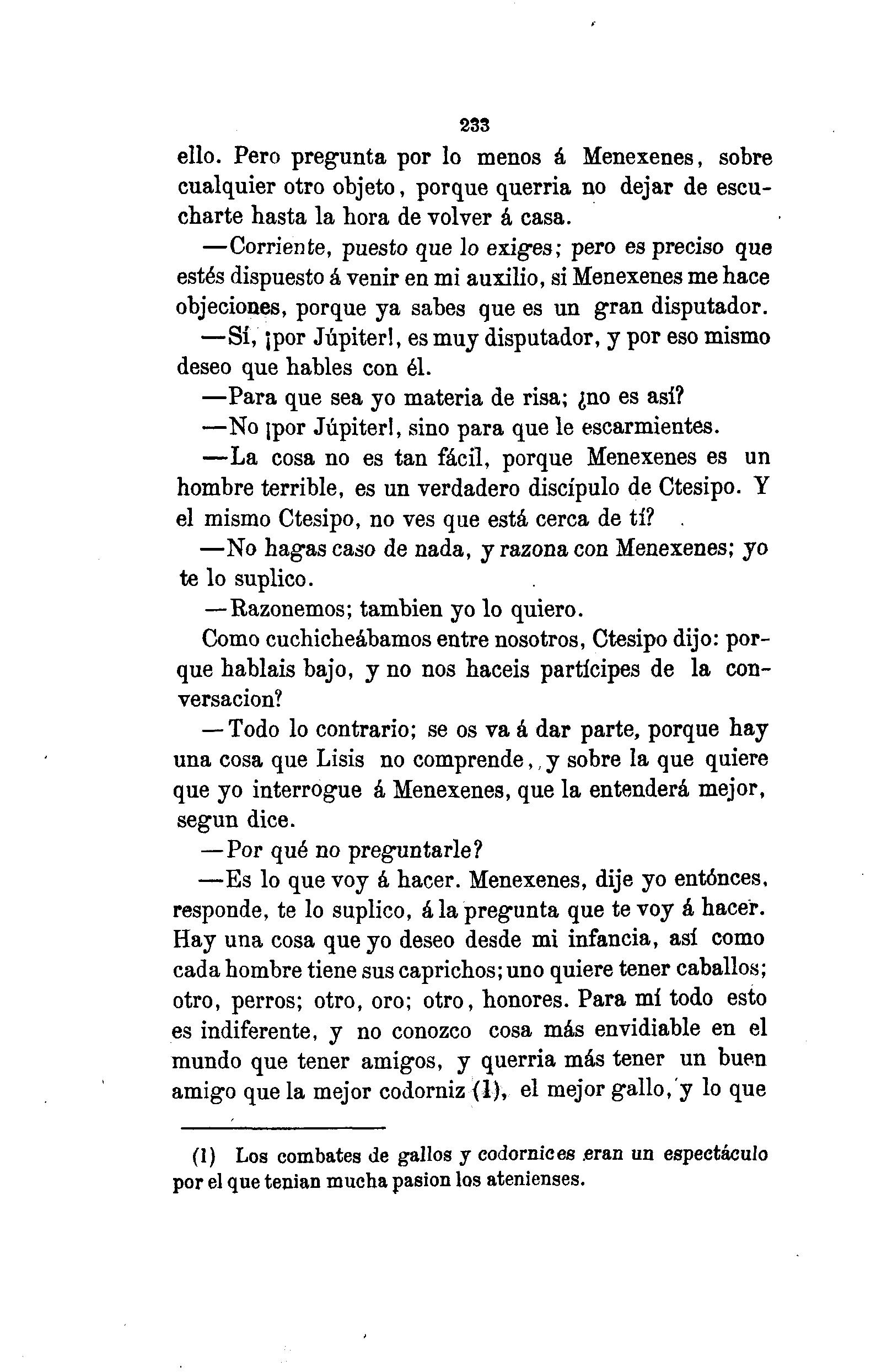 Nada más fácil; no tienes más que entrar allí con Ctesipo, sentarte y ponerte á conversar; y como se celebra hoy la fiesta de Kermes (1), y losjóvenes y los adultos se reimen todos en ese sitio, no dejará Lisis