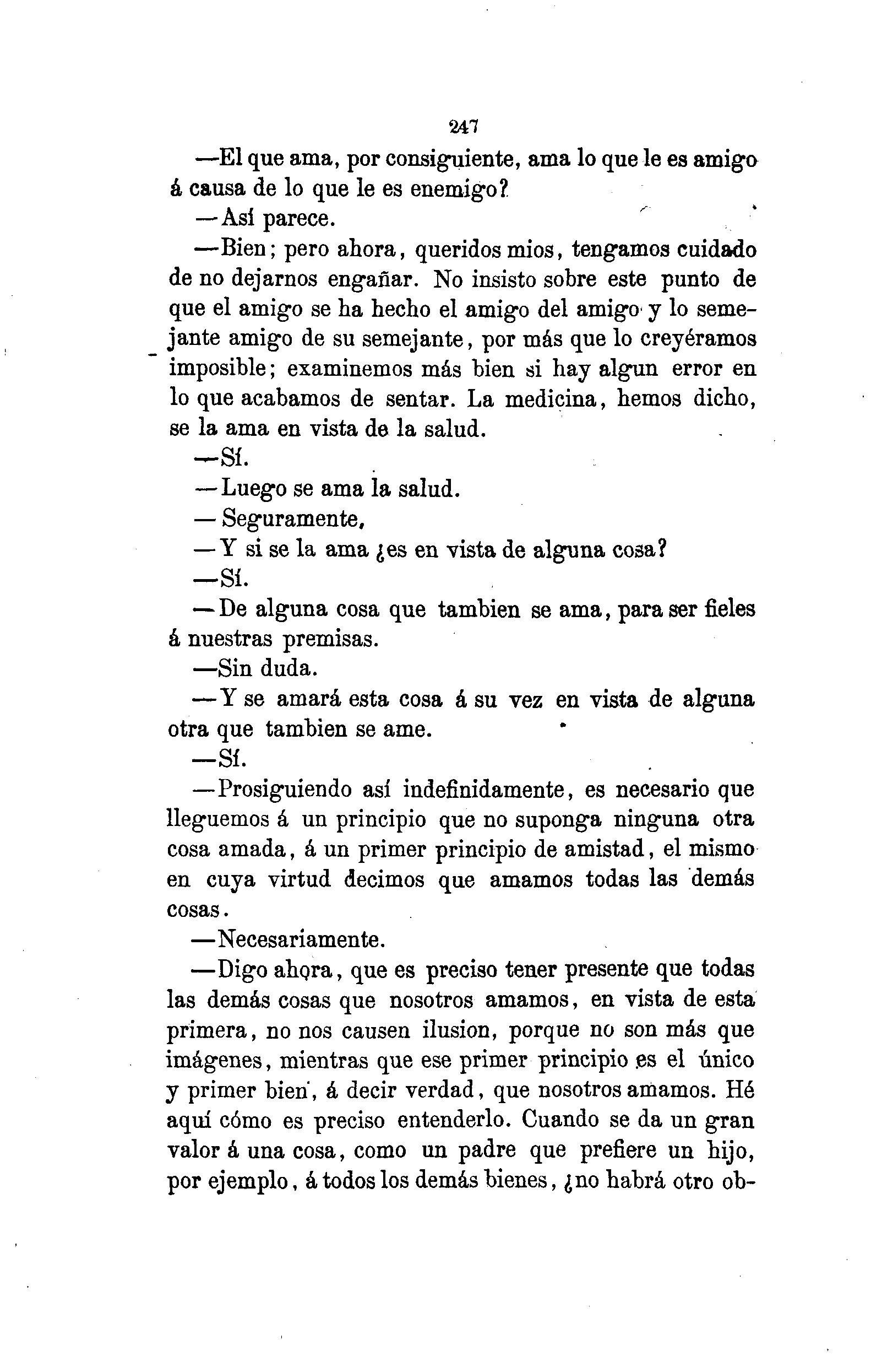 —Prosiguiendo así indefinidamente, es necesario que lleguemos á un principio que no suponga ninguna otra cosa amada, á un primer principio de amistad, el mismo en cuya virtud decimos que amamos todas las demás cosas.