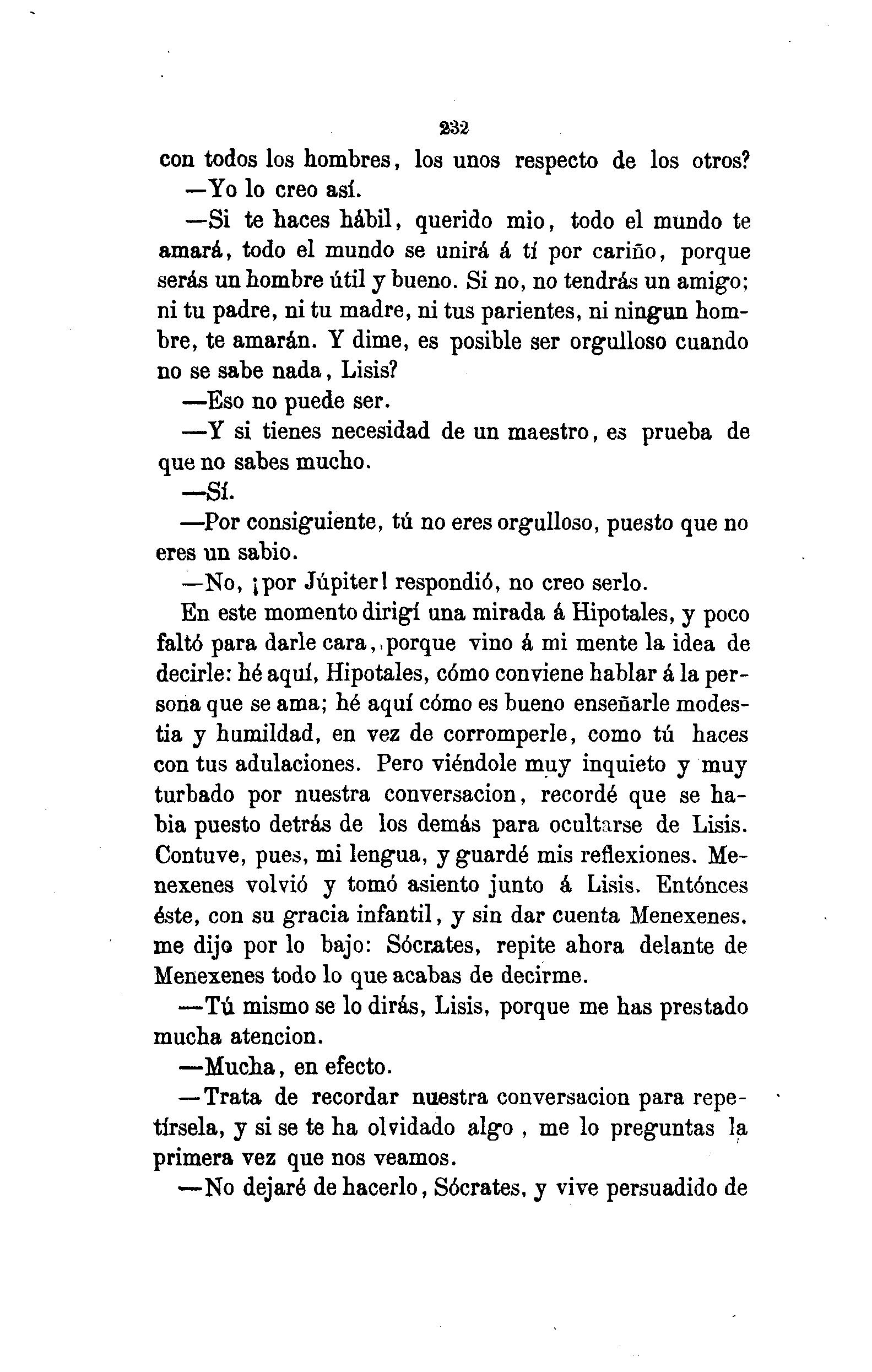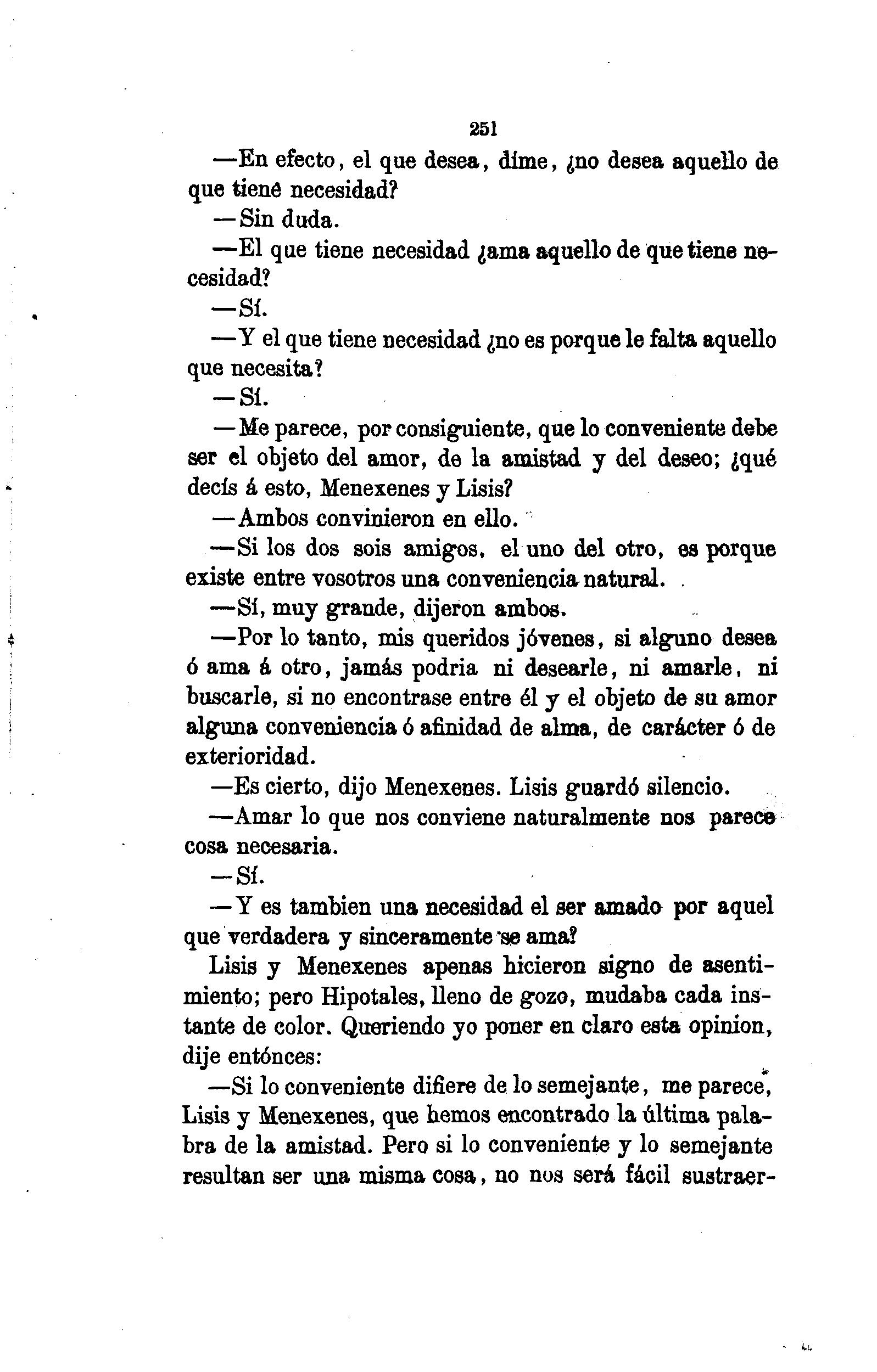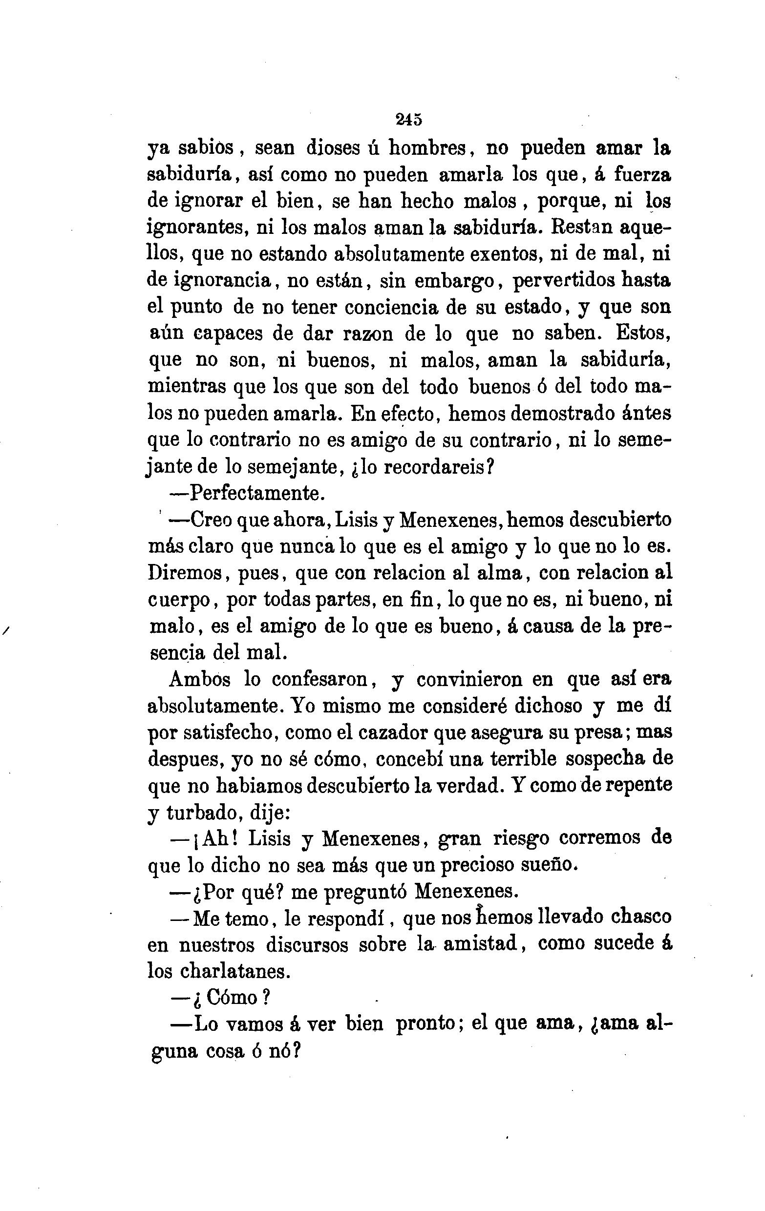 —Creo queahora,Lisisy Menexenes,hemos descubierto másclaro que nunca lo que es el amigo y lo queno lo es. Diremos, pues, que con relación al alma, con relación al cuerpo, por todaspartes, en fin, loquenoes, nibueno, ni malo, es el amigo de lo que es bueno, á causa de la presencia del mal.