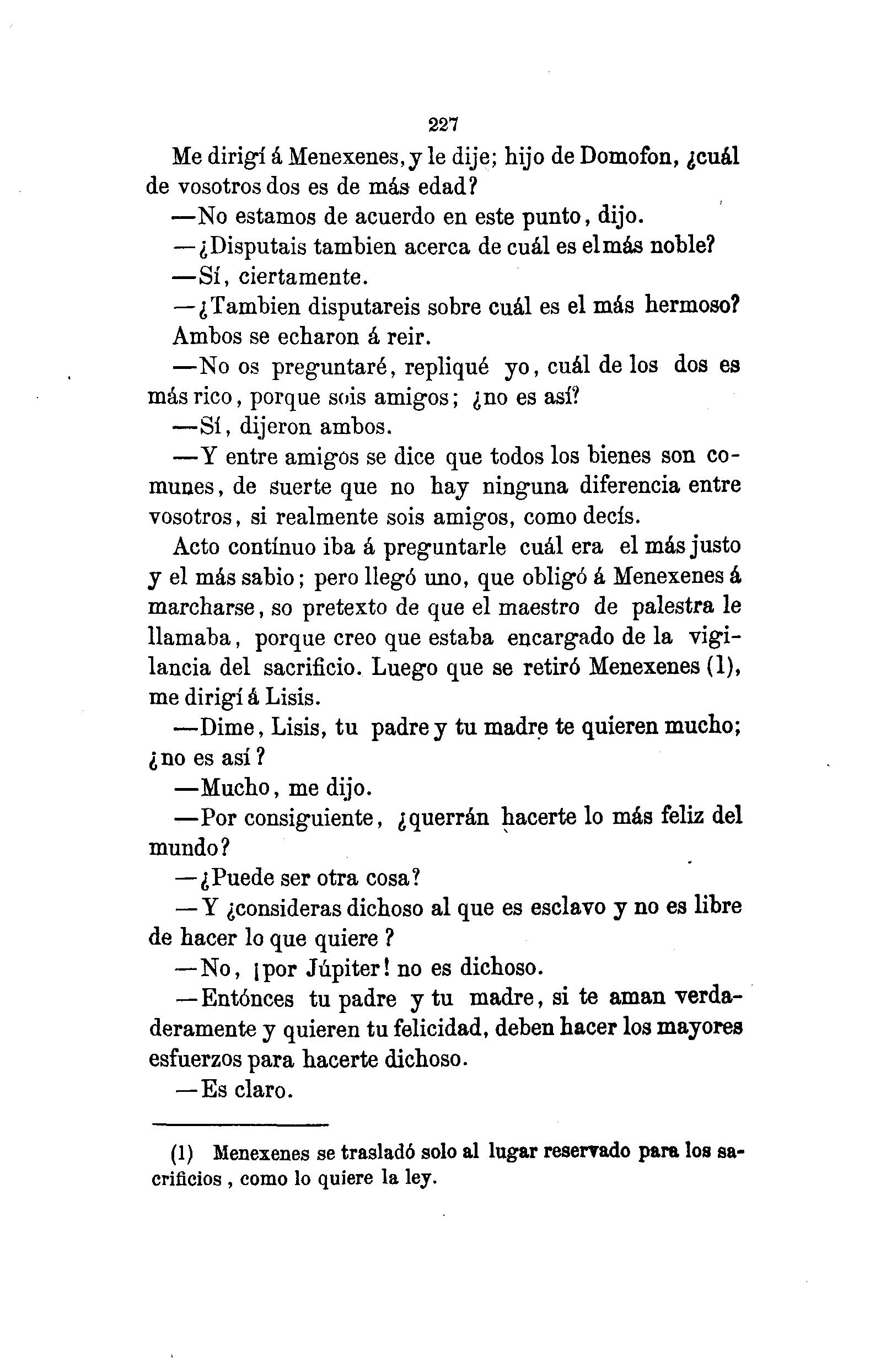 Acto continuo iba á preguntarle cuál era el másjusto y el más sabio; pero llegó uno, que obligó á Menexenes á marcharse, so pretexto de que el maestro de palestra le llamaba, porque creo que estaba encargado de la vigilancia del sacrificio. Luego que se retiró Menexenes (1), me dirigí á Lisis.