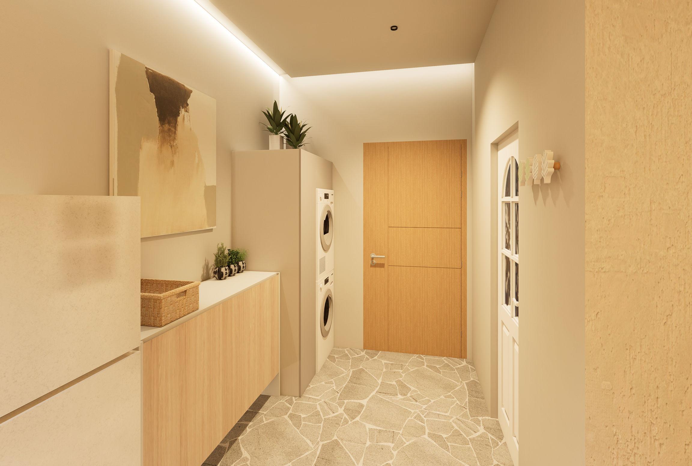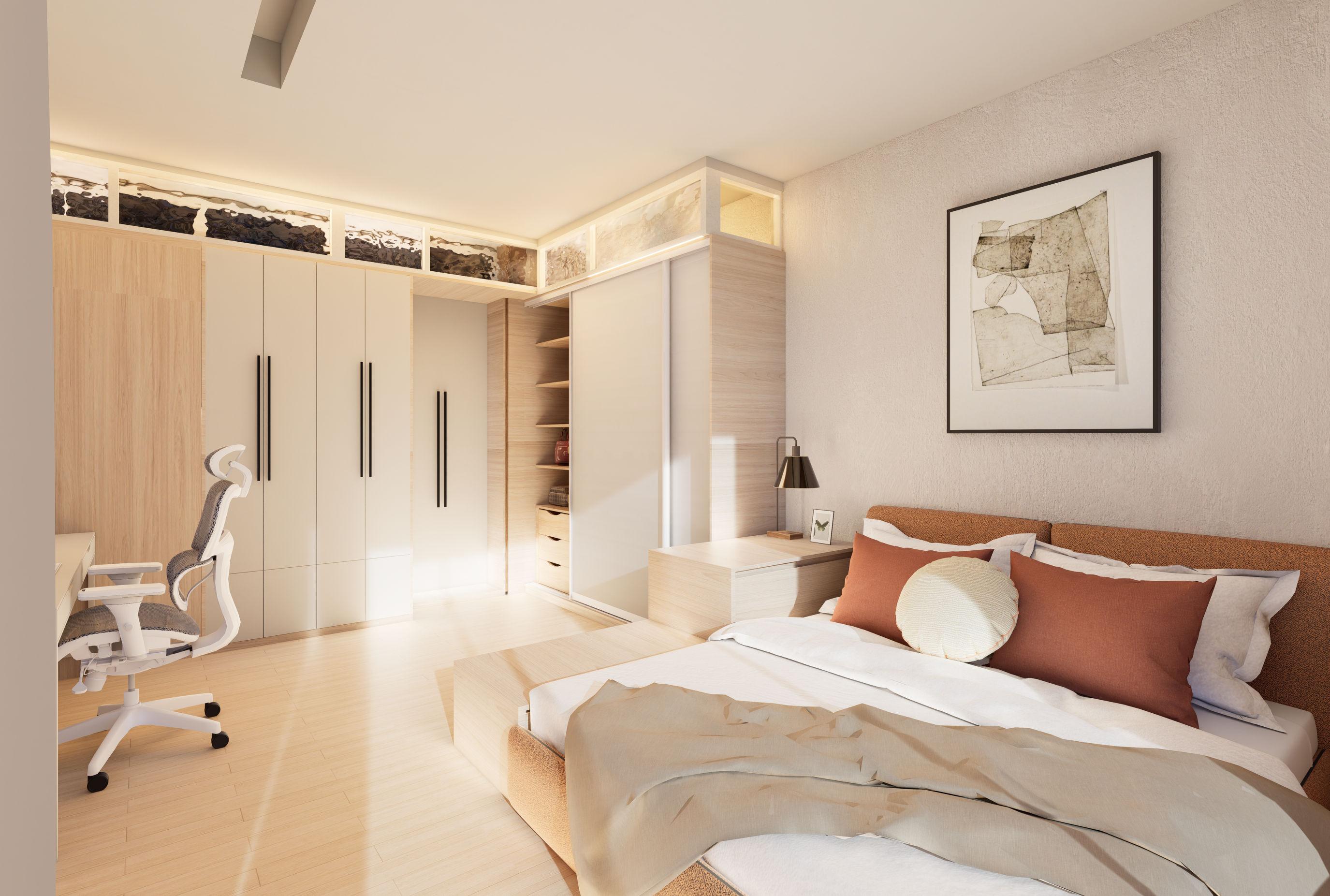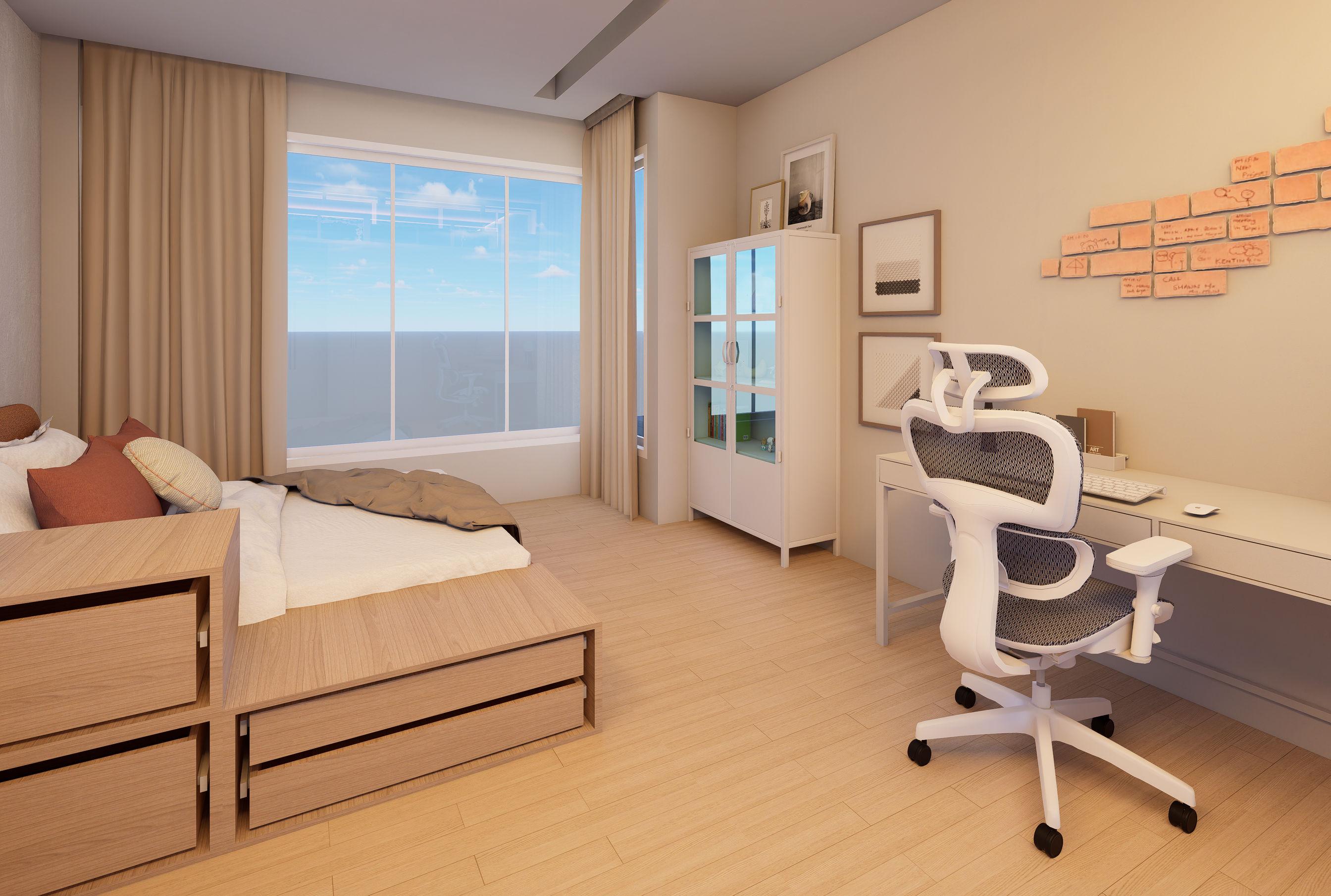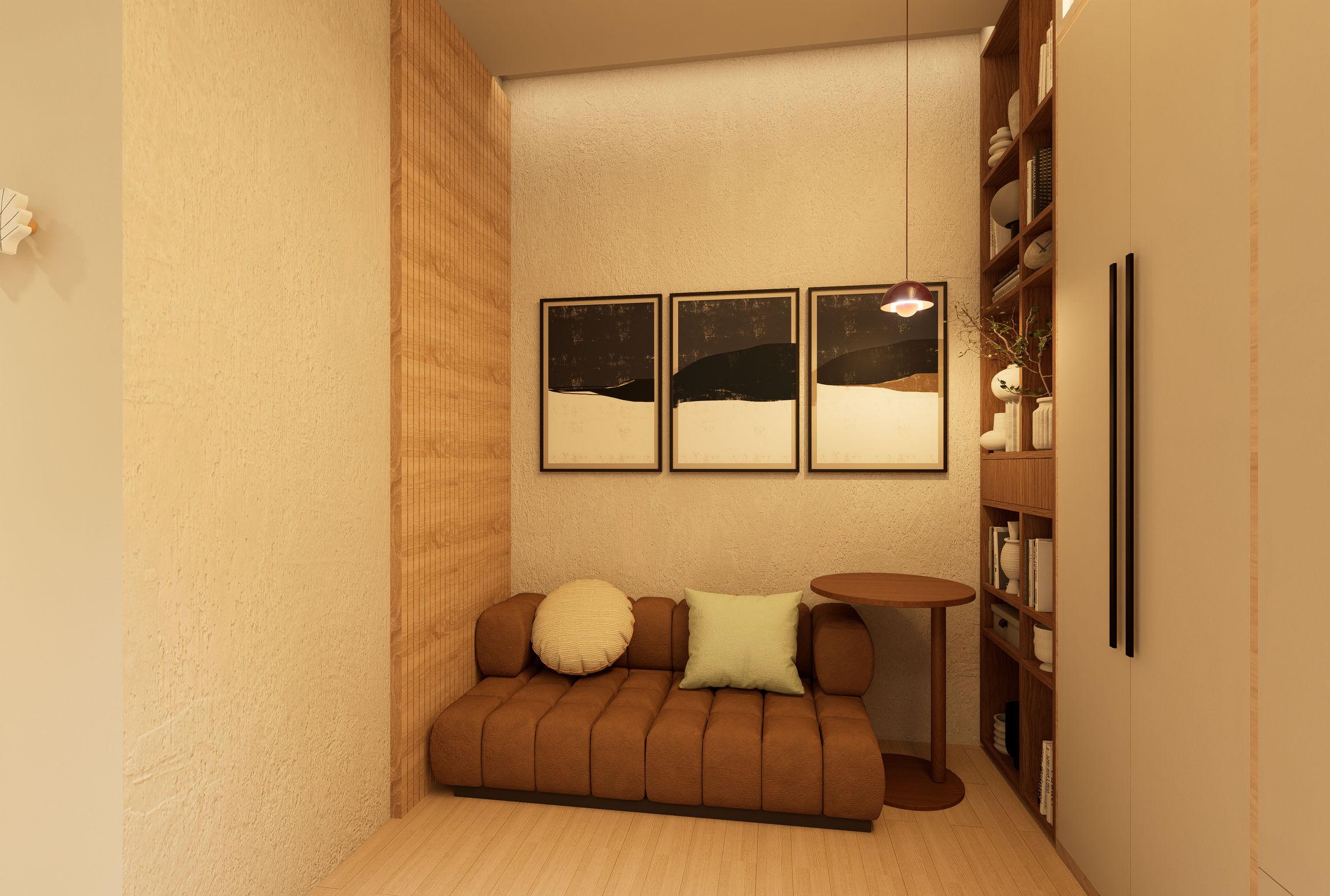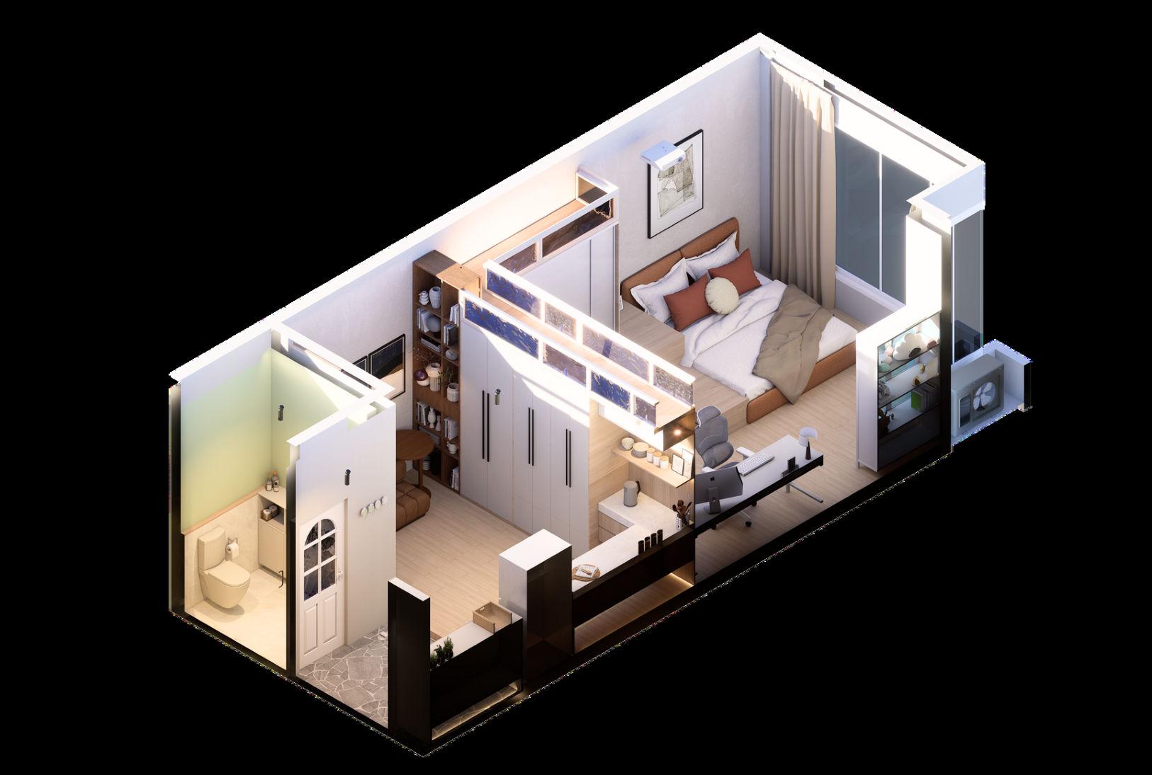 “The Inner Room” revolves around a single woman about 165 cm tall. It uses a sense of security as a key concept, dividing the home mainly into two parts: an outer social transition area leading to the home and a home activity area. A wardrobe is used to hide the main bedroom inside.