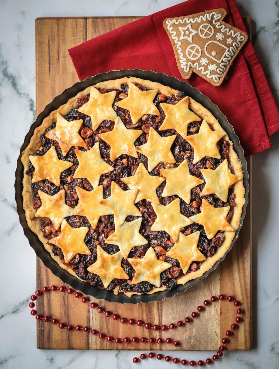 Now, transfer all the mincemeat into the tart base. Take the remaining pastry from under the tea towel and roll out to ¼ inch (5mm) thickness. Cut out stars and place them on top of the mincemeat. Brush the top with almond milk.