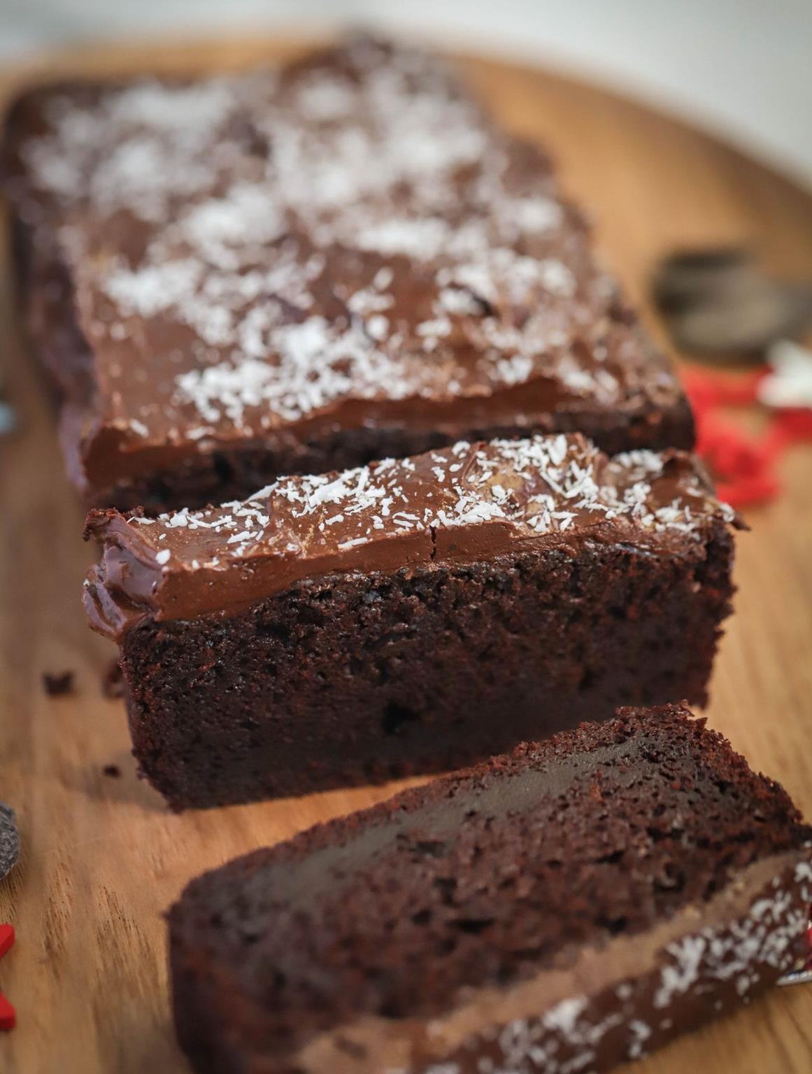 Warm the coconut milk in a small pot until almost boiling. Pour it over the chopped chocolate and let it sit for 5 minutes. Stir the chocolate gently until it’s well combined, smooth and glossy. Set it aside to thicken before covering the top of the cake.