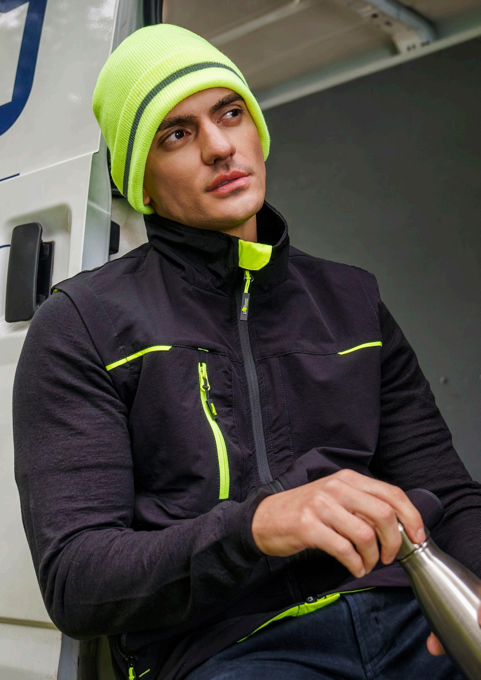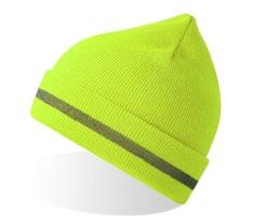Synlighetsbeanie i resirkulert polyestergarn. Lysreflekterende strikket bord på mansjettdesign for høy synlighet. Dobbeltstrikket og sirkulær maskinfinish. Myk og komfortabel.