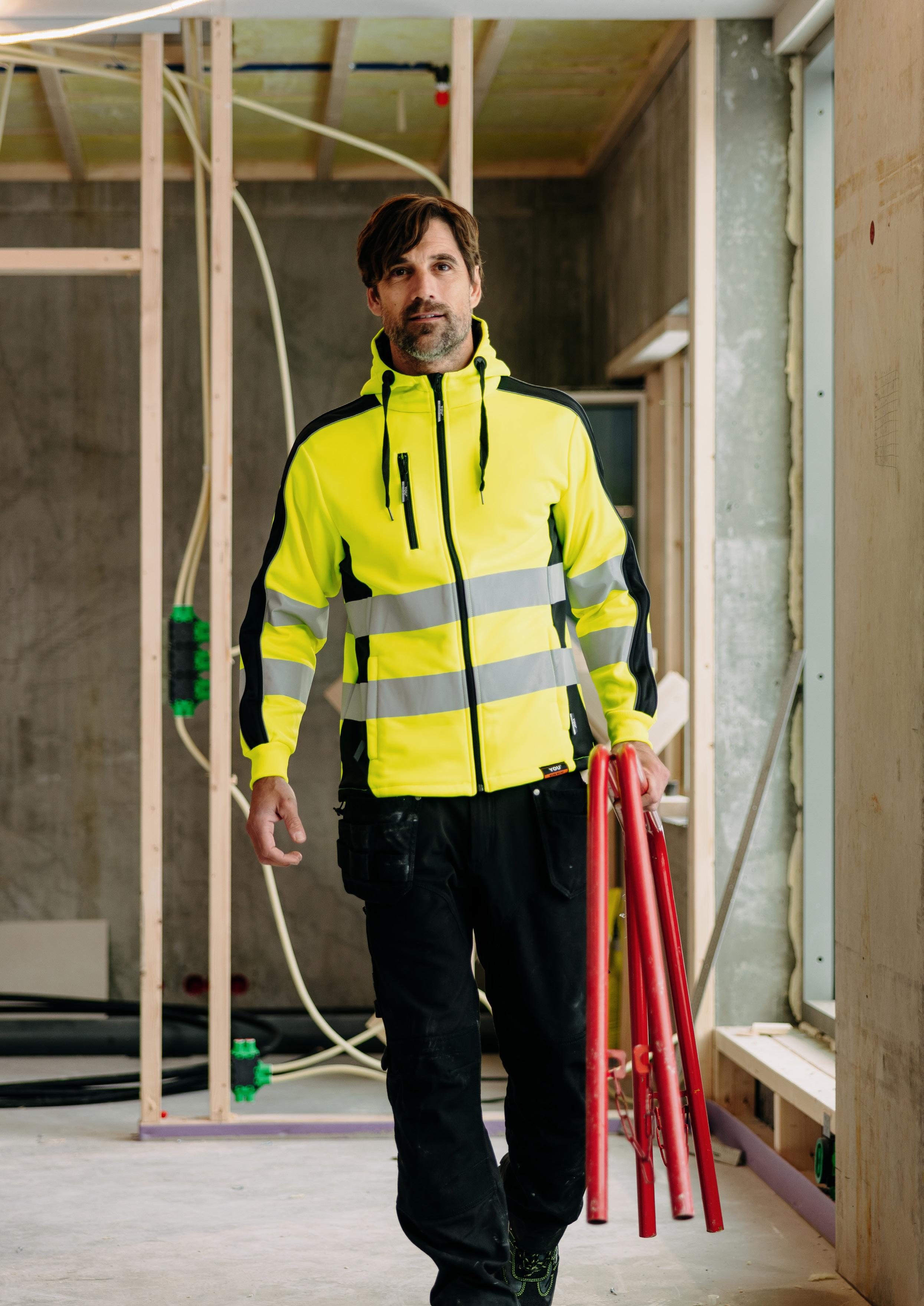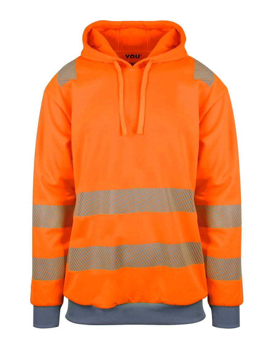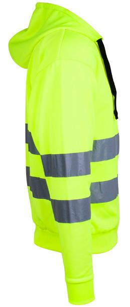 Unisex hettegenser med elastiske reflekser over skuldre, rundt ermer og midje. Kontrastfarget og elastisk ribb i ermer og liv. Flosset innside. CE-merket EN 20471, klasse 2.
