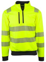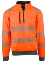 Unisex hi-vi zip sweat med kontrastfelt og elastisk refleks rundt midje og skuldre. Kontrastfelt i sort over skuldre, hals og sidepanel. 3/4 glidelås i halsen. CE-merket EN 20471, klasse 2.