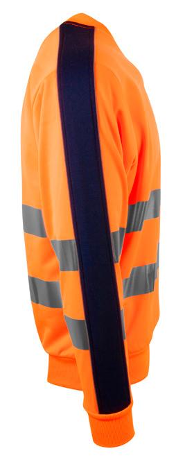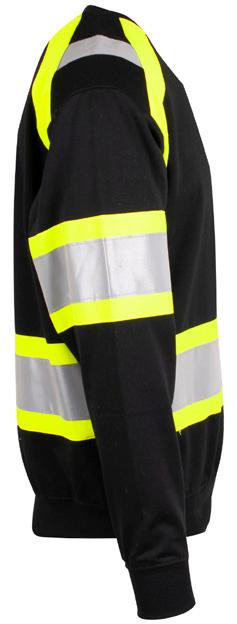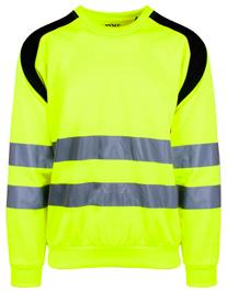 Unisex hi-vi sweatshirt med kontrastfelt og elastisk refleks rundt midje og skuldre. Kontrastfelt i sort over skuldre og sidepanel. CE-merket EN 20471, klasse 2.