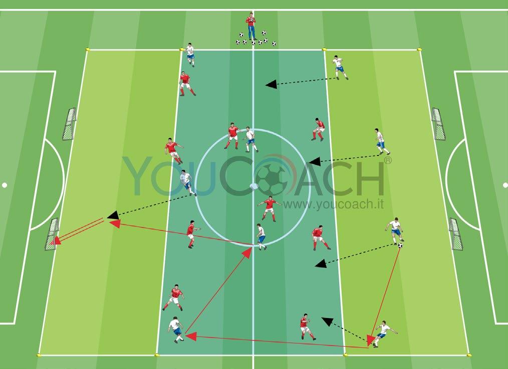Creare uno spazio di gioco di 60×50 metri, delimitando al suo interno, con cinesini di diverso colore, due zone larghe 20 metri, a partire dalla linea del fondo: si ottengono così tre zone, due laterali e una centrale. Posizionare due porticine al di fuori di ciascuna linea di fondo, a circa 18 metri l’una dall’altra. Sistemare i palloni fuori dal terreno di gioco, vicino allo spazio centrale, in modo che un membro dello staff possa introdurli. Formare due squadre da nove giocatori. Entrambe le squadre, sia quella che attacca che quella che difende, in fase iniziale si schierano con il 4-2-3, in modo da avere una parità numerica in zona centrale.