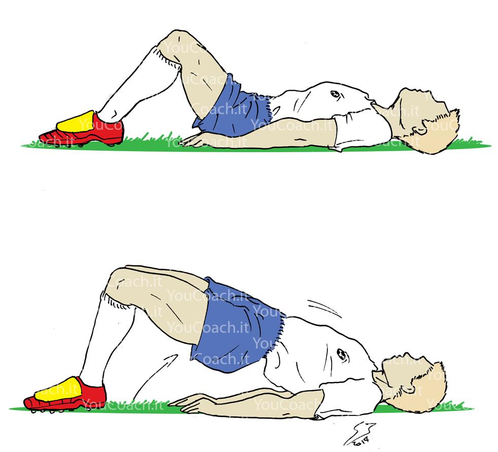 • From the supine position, with your head, shoulders and back leaning on the ground, lift the hips and the back, creating a diagonal from the shoulders to the knees, trying to find stability with the support of shoulders and feet on the ground (Figure 4)
